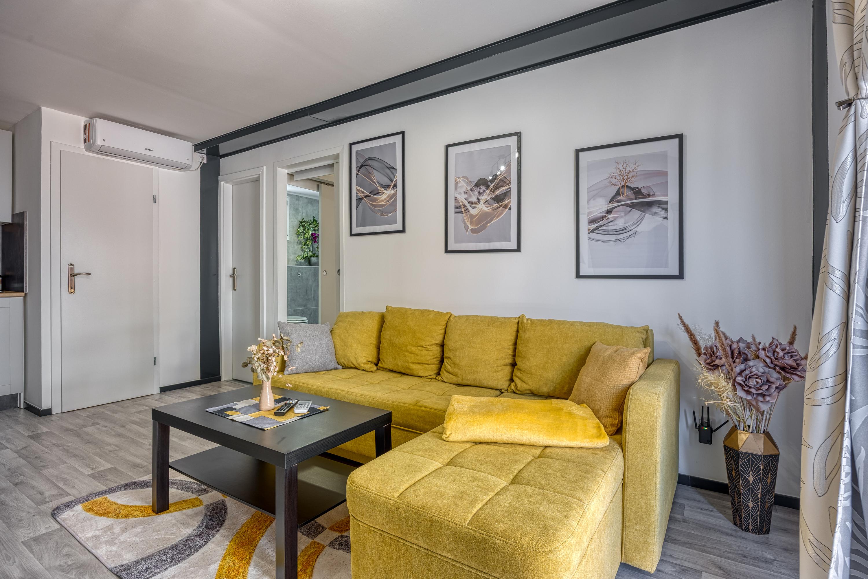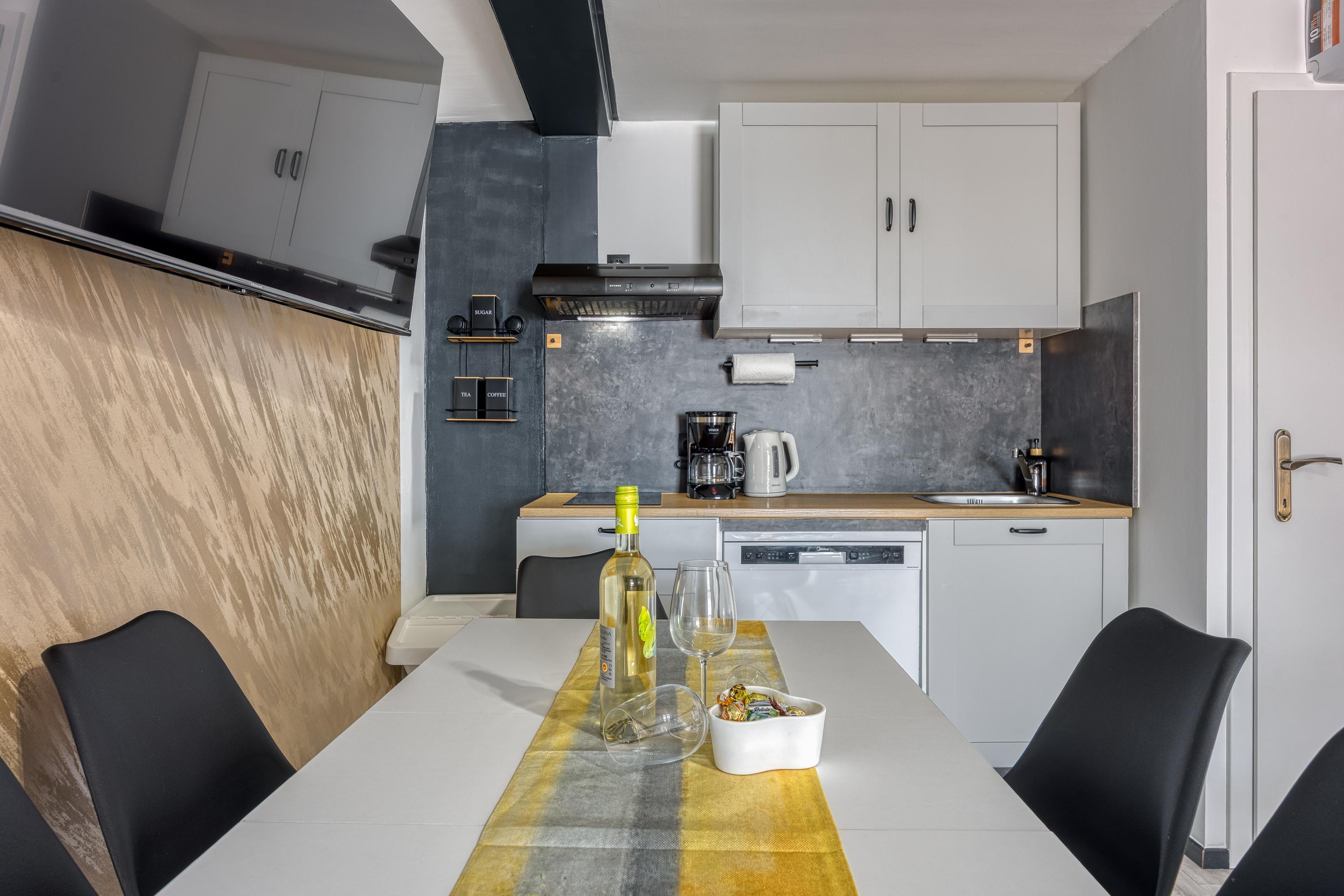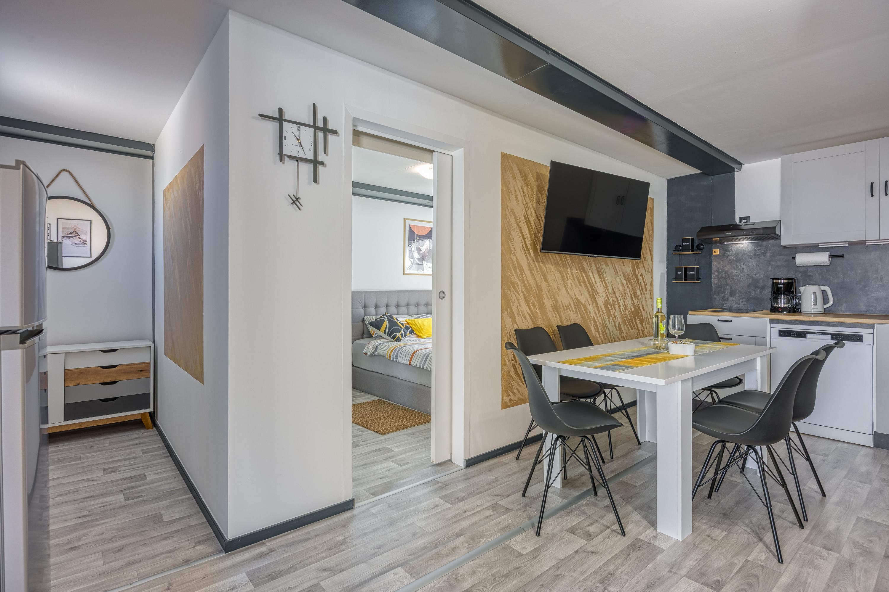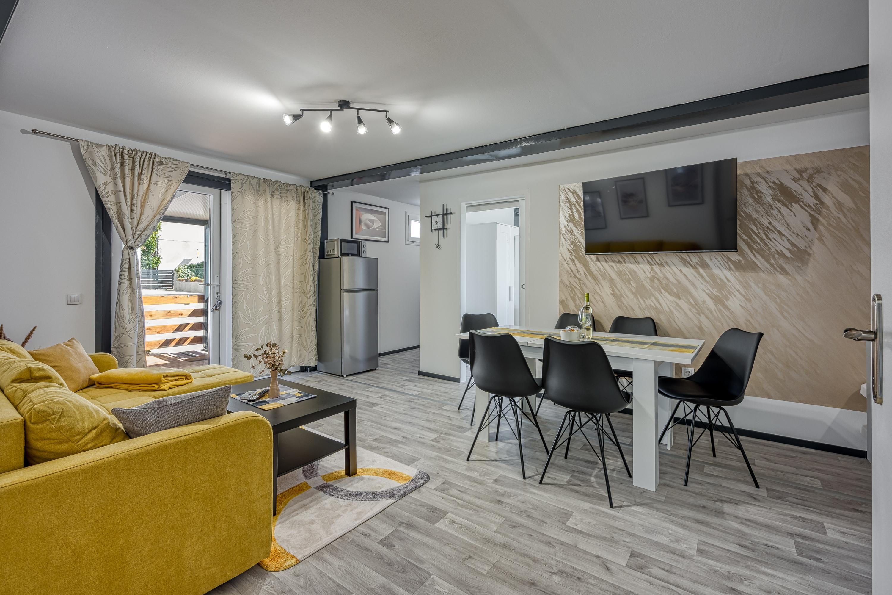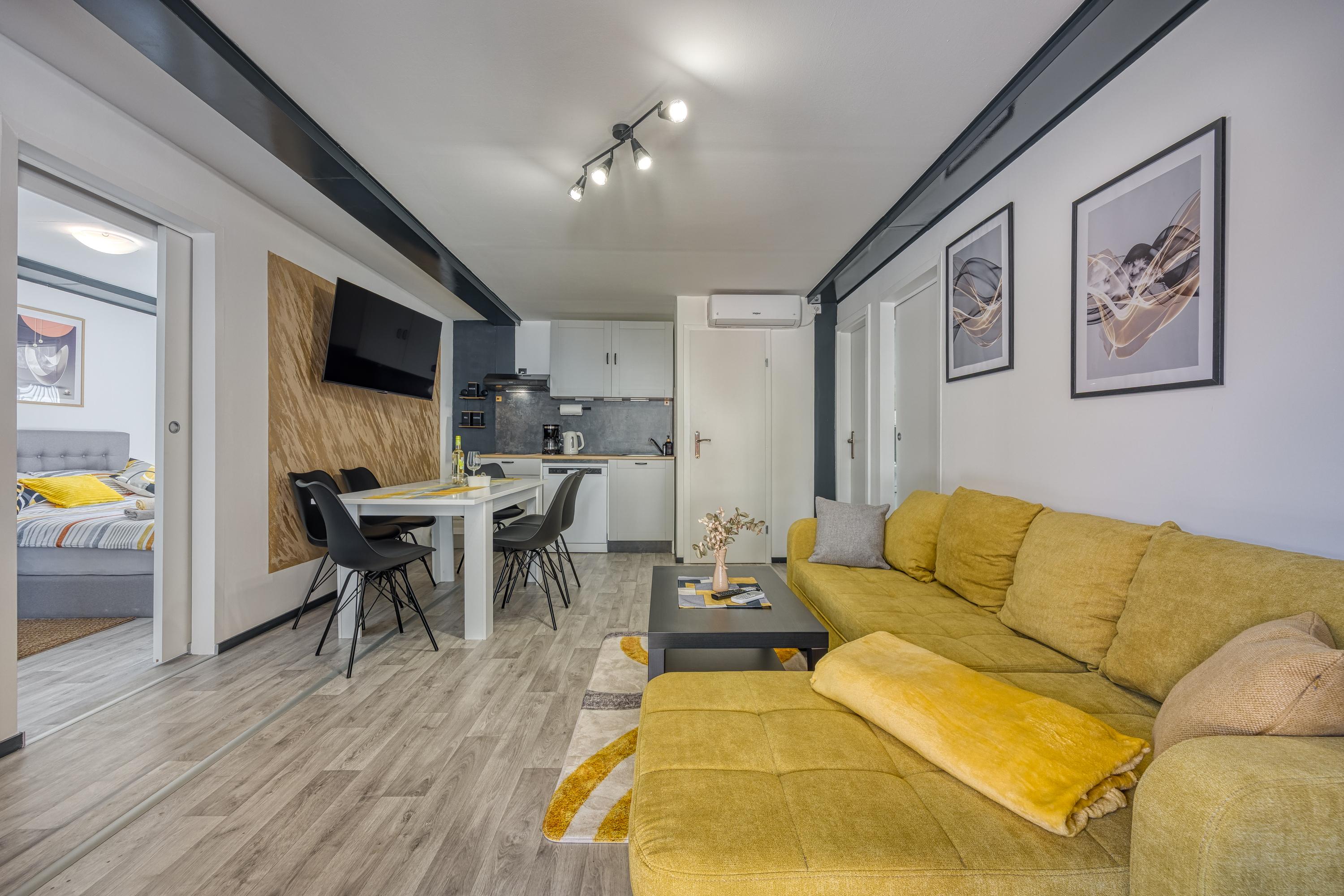Durch die Eingangstür gelangt man in den offenen Wohnbereich, der ein stilvolles L-förmiges Sofa, einen großen Flachbildfernseher, einen Esstisch für 6 Personen und eine neue Einbauküche umfasst.