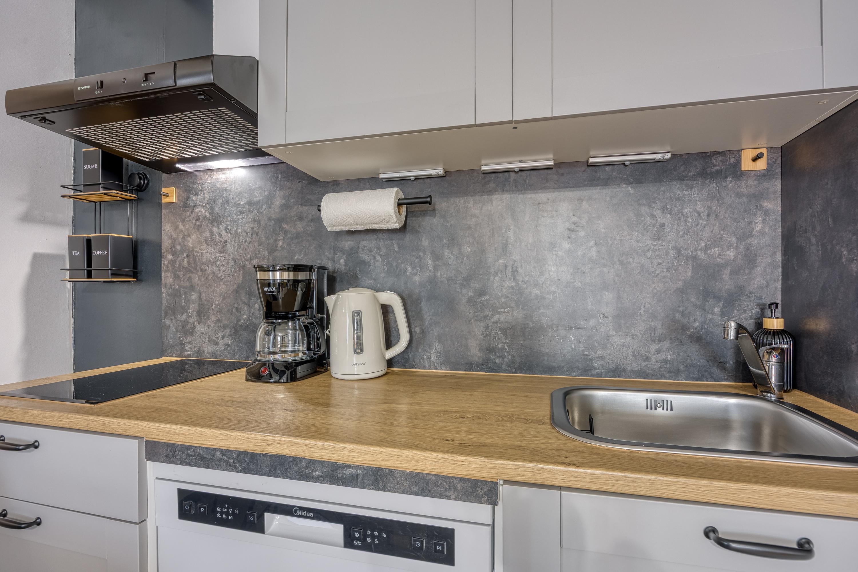 Die Küche ist gut ausgestattet mit Herd, Backofen, Mikrowelle, Geschirrspüler, Kühl-/Gefrierschrank und einer Kaffeemaschine.