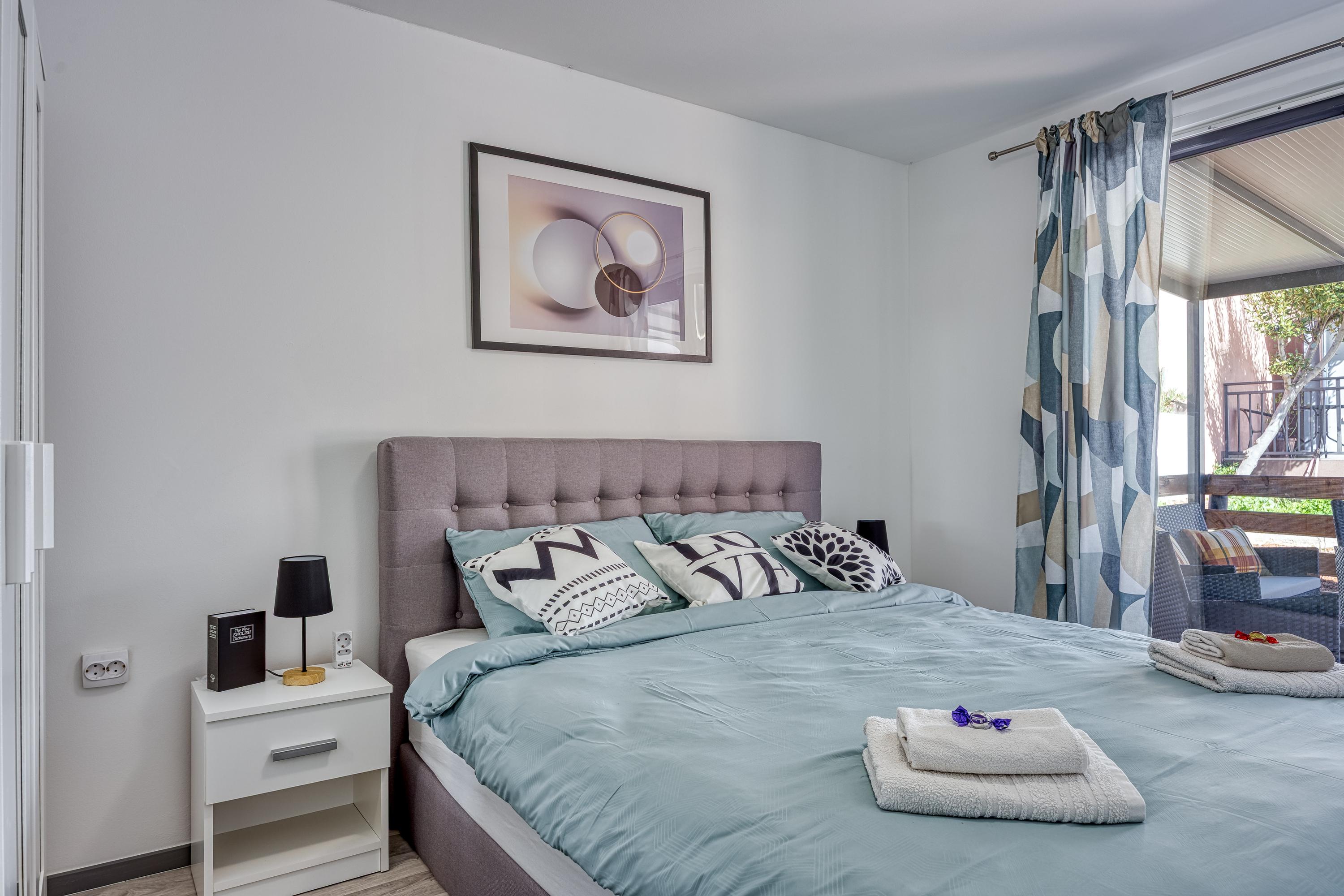 Schlafzimmer 1: Das Hauptschlafzimmer hat ein Doppelbett, einen Kleiderschrank und Fenstertüren, die auf die Veranda führen.