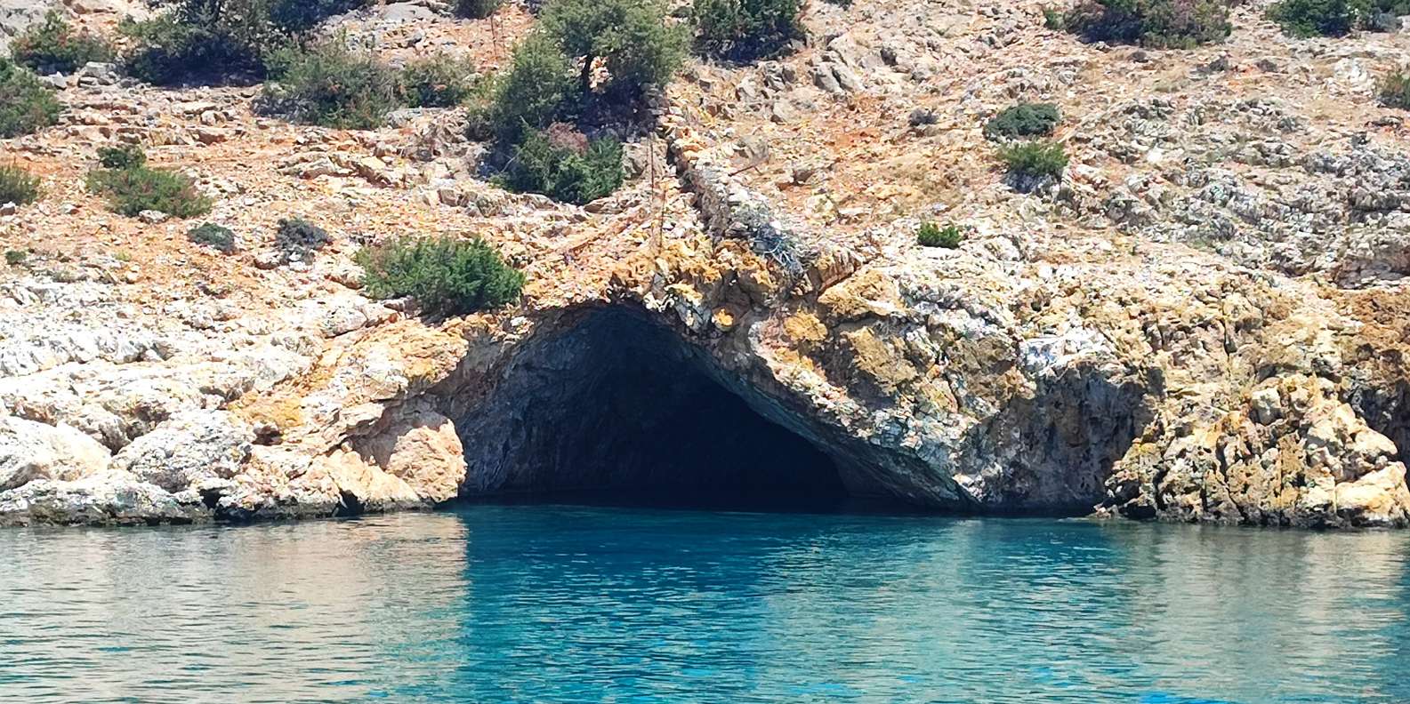 Am Ende deines dritten Stopps kommst du zum erstaunlichen Naturwunder, der Rina-Höhle an der Südküste von Naxos. Du kannst vom Boot springen oder die Leiter hinuntergehen, um in der Rina-Höhle zu schwimmen. Kletter auf Felsen und erkunde die Landschaft