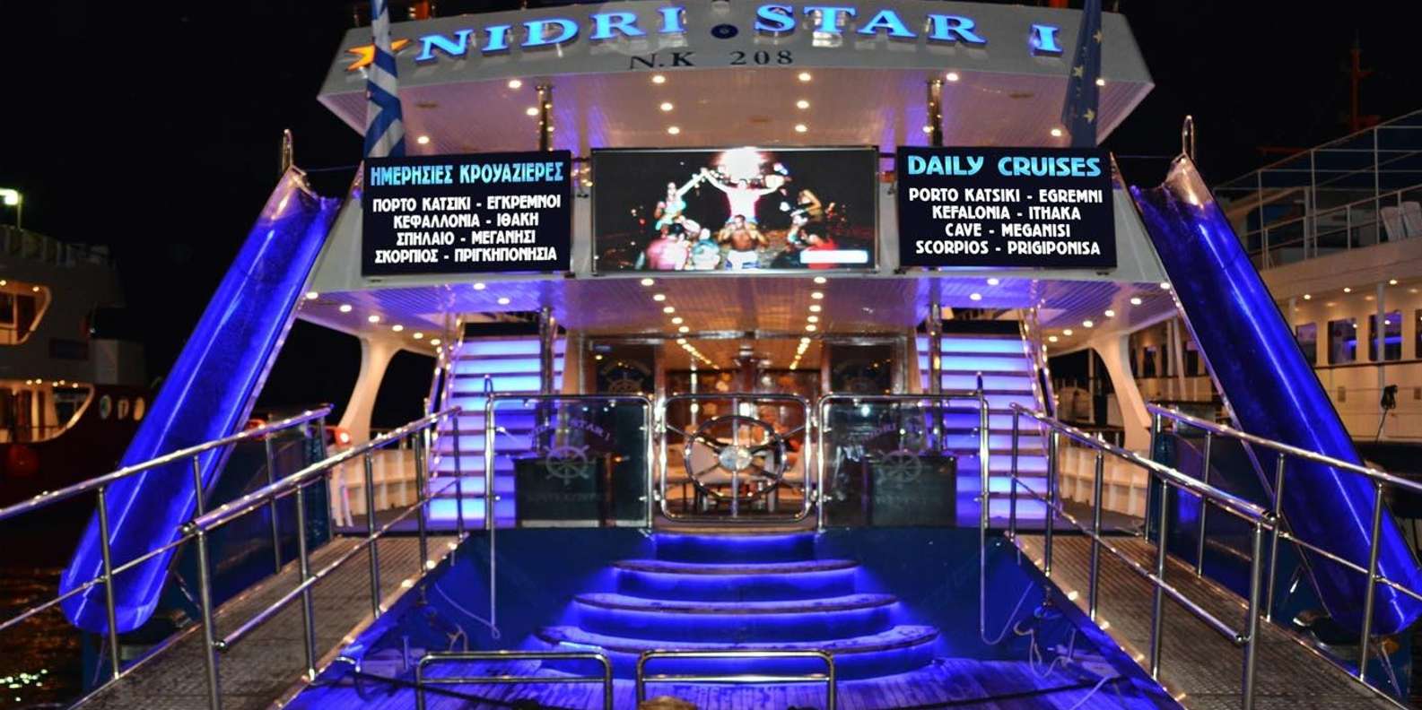 Genießen Sie die Nidri Star 1 auf dieser fantastischen Bootsfahrt, bei der Sie an der Bar internationale Markengetränke, Snacks und Eiscreme genießen können. Sie können so viel Sonne genießen, wie Sie möchten, und es gibt auch viele schattige Bereiche und Sonnenschirme. Außerdem gibt es an Bord in unserer luxuriösen, vollständig klimatisierten Innenlounge einen sicheren Kinderspielbereich.
