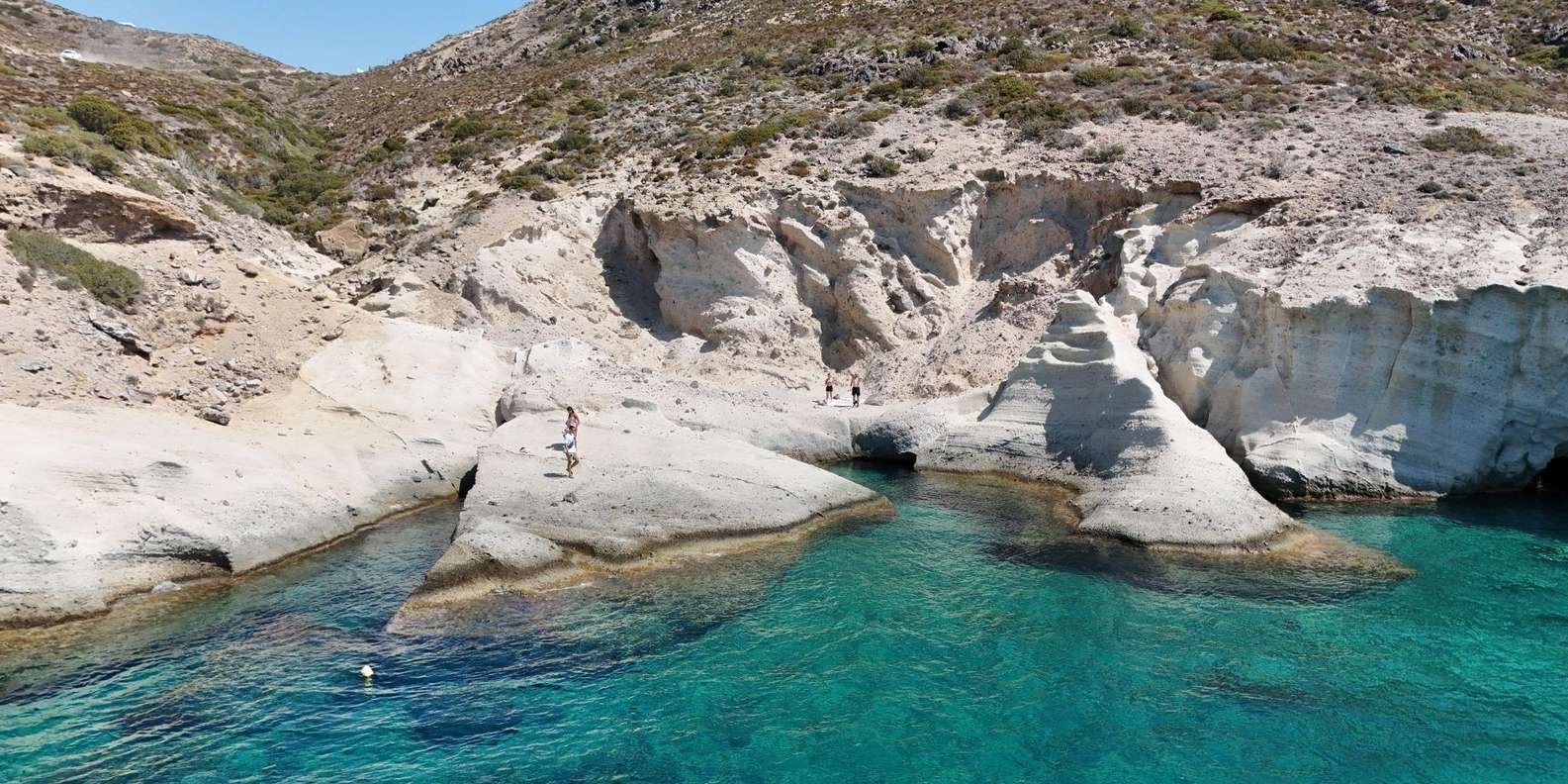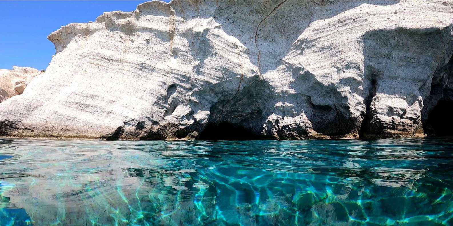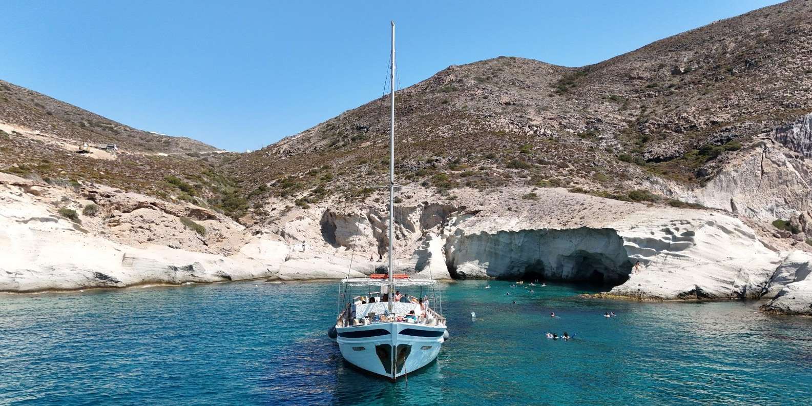 - Als Nächstes segeln wir entlang der felsigen Küste im Süden von Antiparos zur Mastichari-Höhle, wo du Meereshöhlen unter weißen Klippen erkunden oder dich sogar im Klippenspringen versuchen kannst.