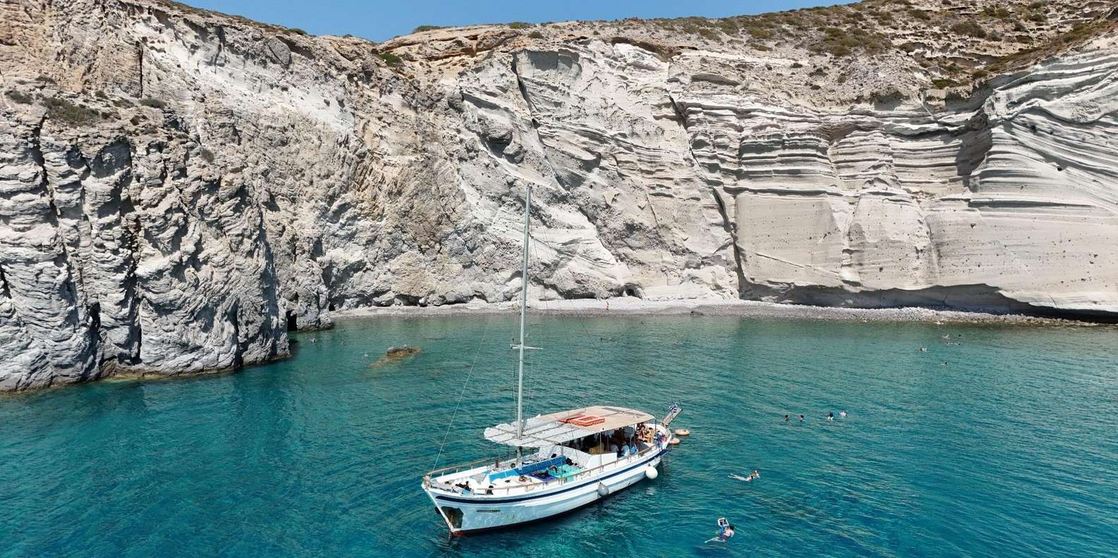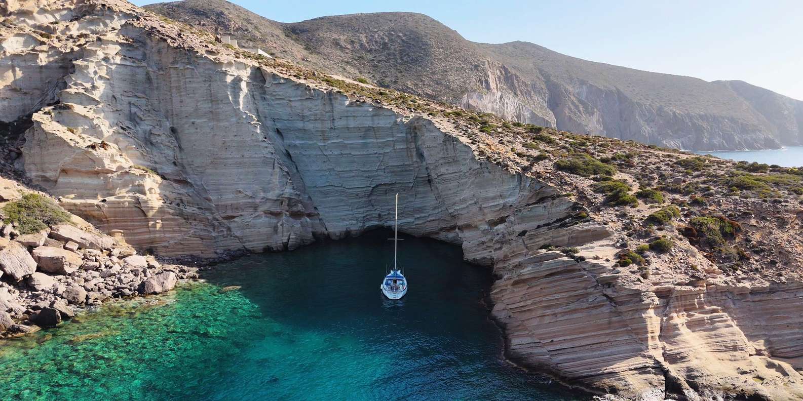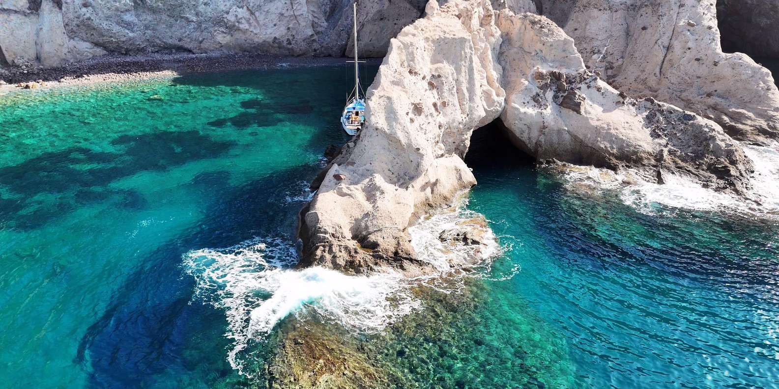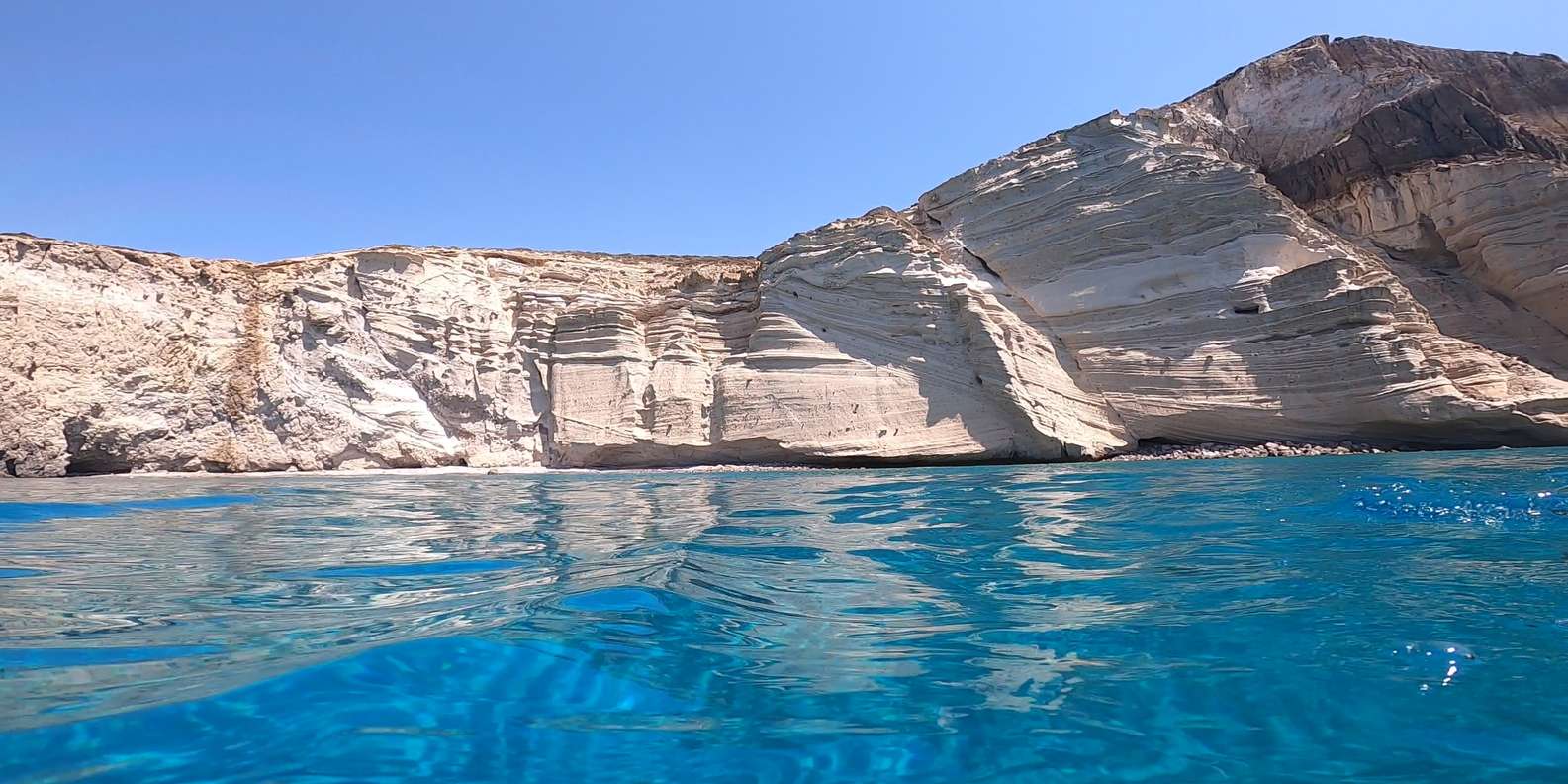 - Als Nächstes segeln wir entlang der felsigen Küste im Süden von Antiparos zur Mastichari-Höhle, wo du Meereshöhlen unter weißen Klippen erkunden oder dich sogar im Klippenspringen versuchen kannst.