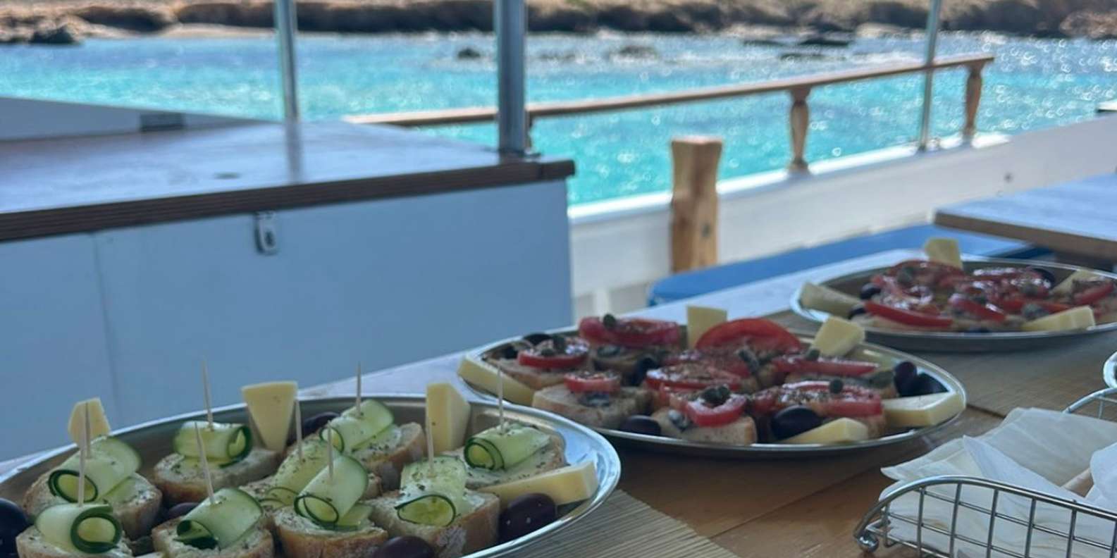 Unser erstes Ziel ist Panteronissia, auch bekannt als die Blaue Lagune. Genieße an Bord einen Morgenkaffee oder einen Saft, während wir in Richtung des kristallklaren, flachen, azurblauen Wassers segeln - ein verstecktes Juwel, das auf dem Landweg nicht zu erreichen ist. Nach einem erfrischenden Bad genießt du einheimische Köstlichkeiten wie marinierten Fisch und frische Gartentomaten, begleitet von Ouzo oder Wein.