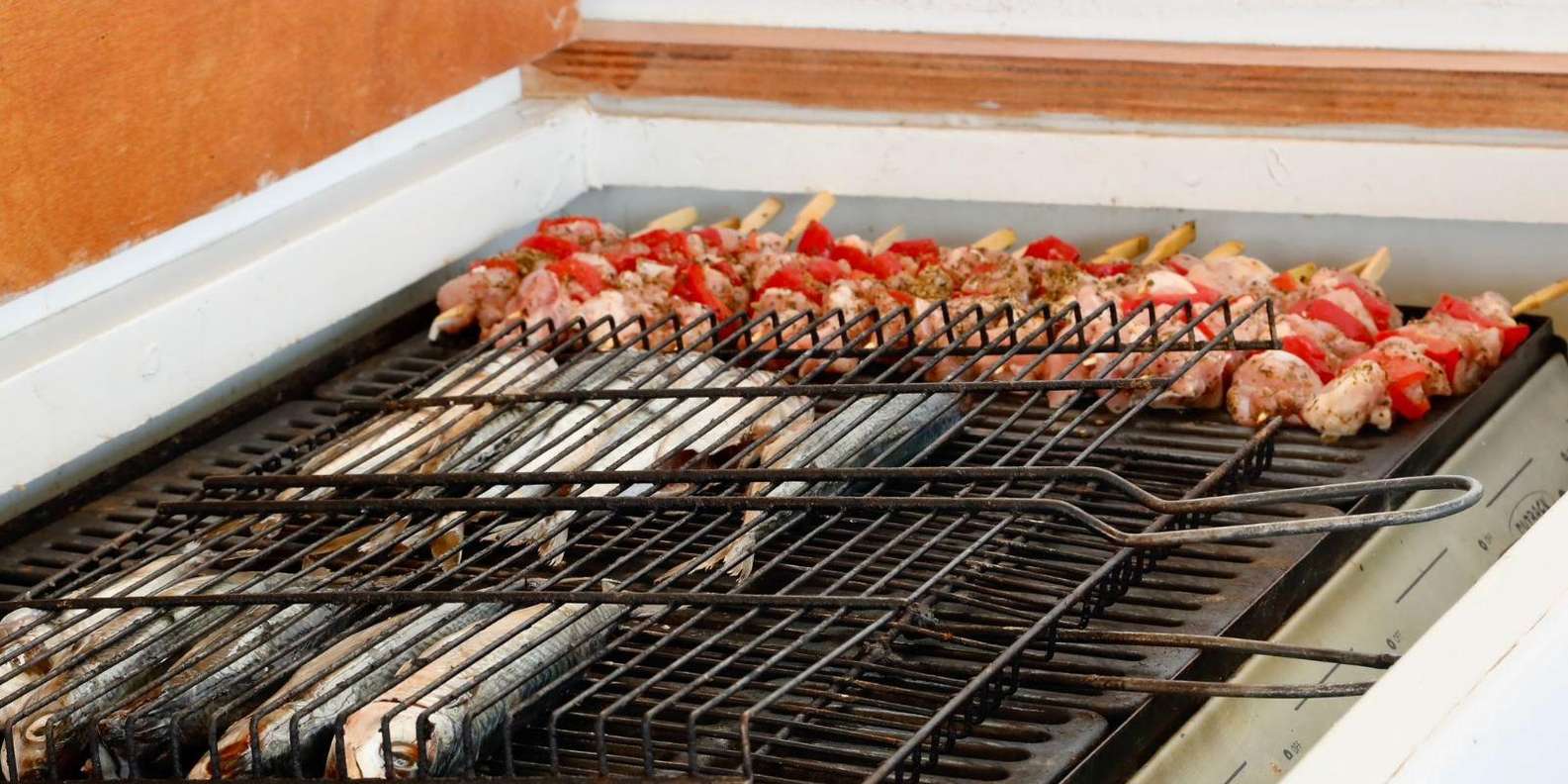 Gegrilltes Mittagessen an Bord (Hähnchen-Souvlaki, Seebarsch oder geröstetes Gemüse)