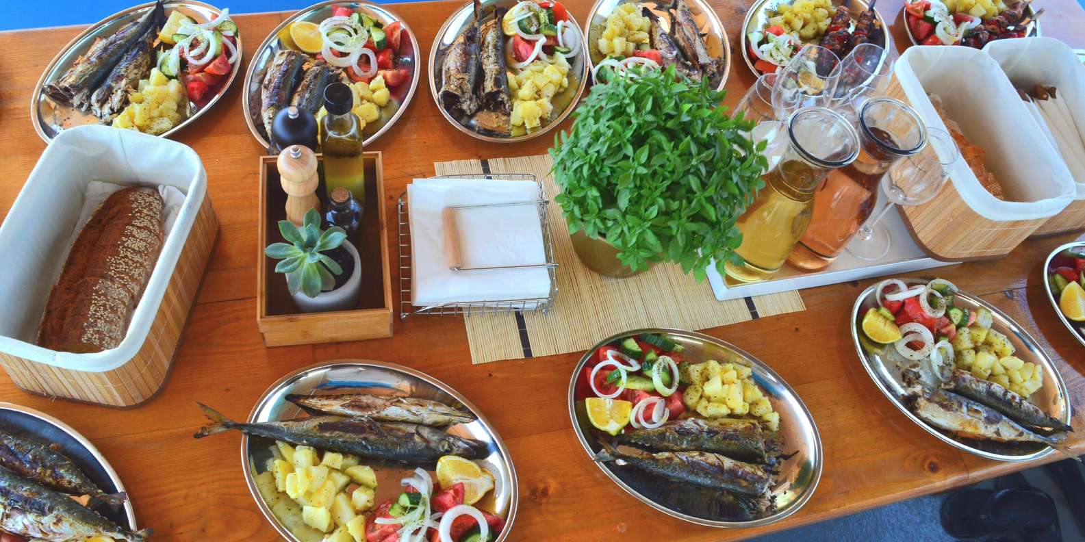 - Nachdem wir die berühmte Epitaphios-Höhle passiert haben, erreichen wir Despotiko, wo wir ein traditionelles griechisches Mittagessen einnehmen. Wähle zwischen gegrilltem frischem Fisch oder Hähnchen-Souvlaki, serviert mit griechischem Salat, Kartoffelsalat und kaltem Bier.