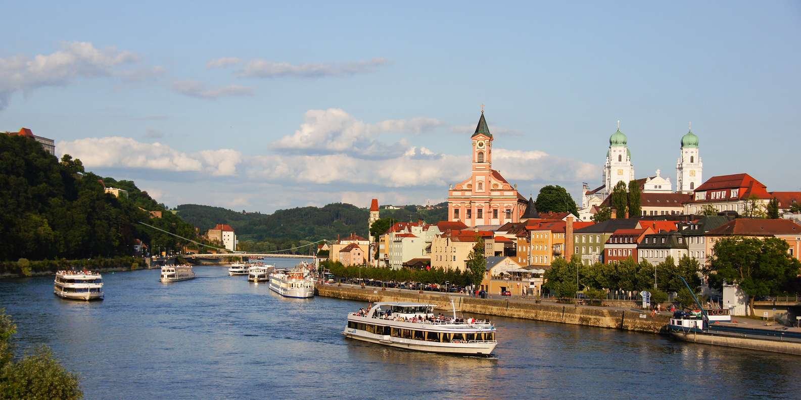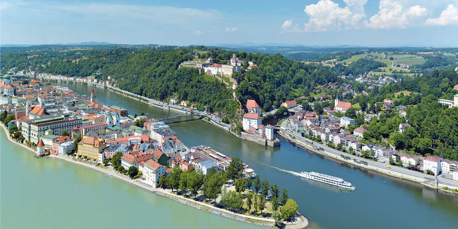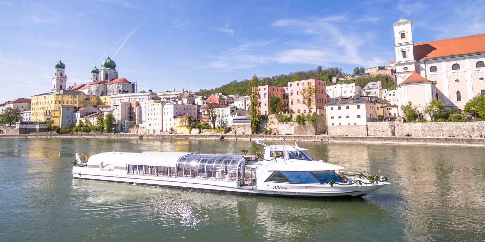 Lass dich bequem vom Boot aus treiben und genieße unvergessliche Ausblicke auf Passau: das italienische Flair der bunten Fassaden, den Stephansdom, die Mündung der drei Flüsse Donau, Inn und Ilz mit i