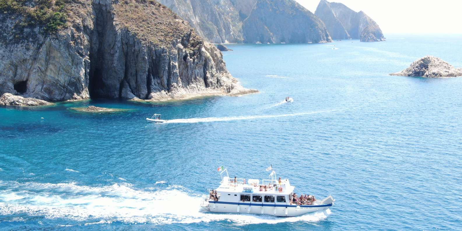 Diese Route mit einer weniger detaillierten Route als die Linienverkehre, die um eine einzelne Insel herum führen, ist die ideale Lösung für Touristen, die einen Panoramablick auf die beiden Inseln haben möchten. Von Molo Musco aus geht es zunächst an der Südostseite von Ponza entlang, mit einem Besuch der Pilatushöhlen, bis nach Capo Bianco. Von hier aus geht es in Richtung der Insel Palmarola. Die Fahrt dauert etwa 40 Minuten. Die Umrundung von Palmarola beginnt im Süden der Insel. Ein Halt am Strand "O' Francese" ist geplant. Sobald die Palmarola-Umrundung beendet ist, geht die Tour um Ponza weiter. Es geht weiter zur bezaubernden Bucht Lucia Rosa mit ihren eindrucksvollen Faraglioni, Cala Feola mit ihren natürlichen Pools, Cala dell'Acqua, Cala Fonte, Cala Felci, Cala Gaetano, Spaccapolpi, Cala Inferno, Cala del Core, Cala Frontone. Sobald die Route rund um Ponza abgeschlossen ist, kehren wir zum Hafen von Bourbon zurück.
