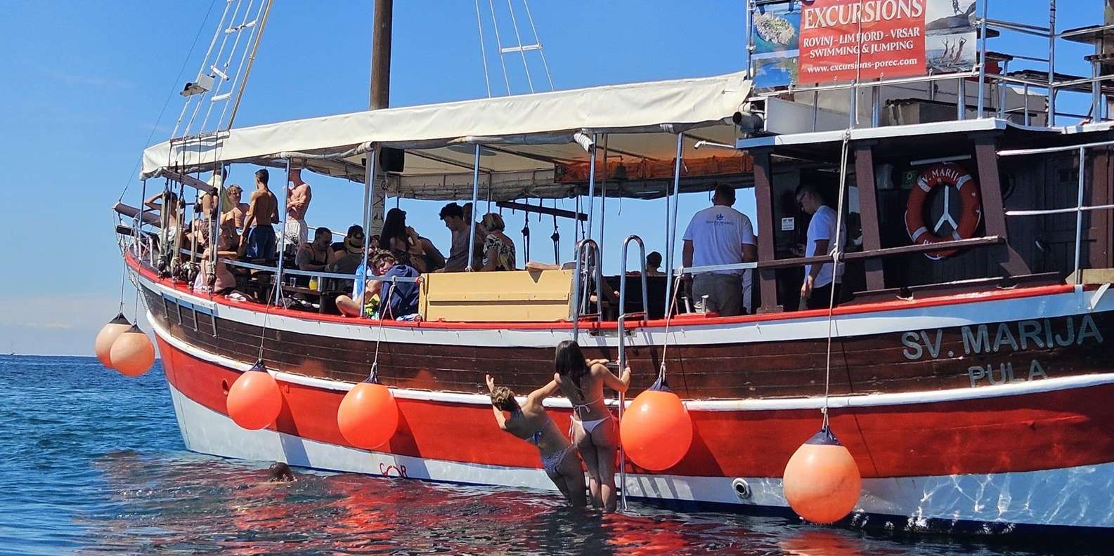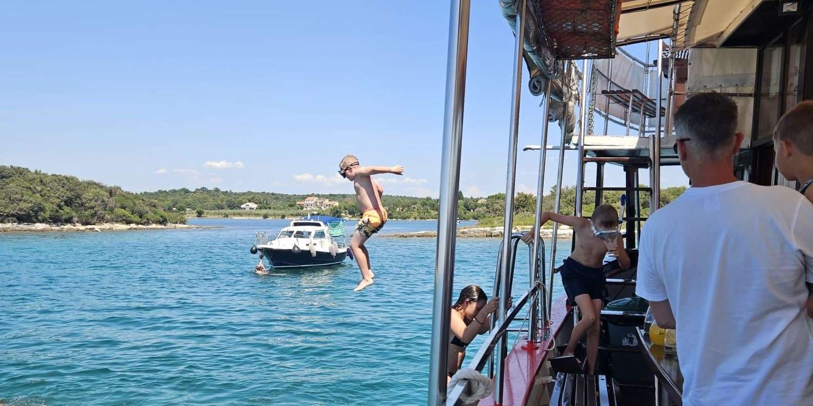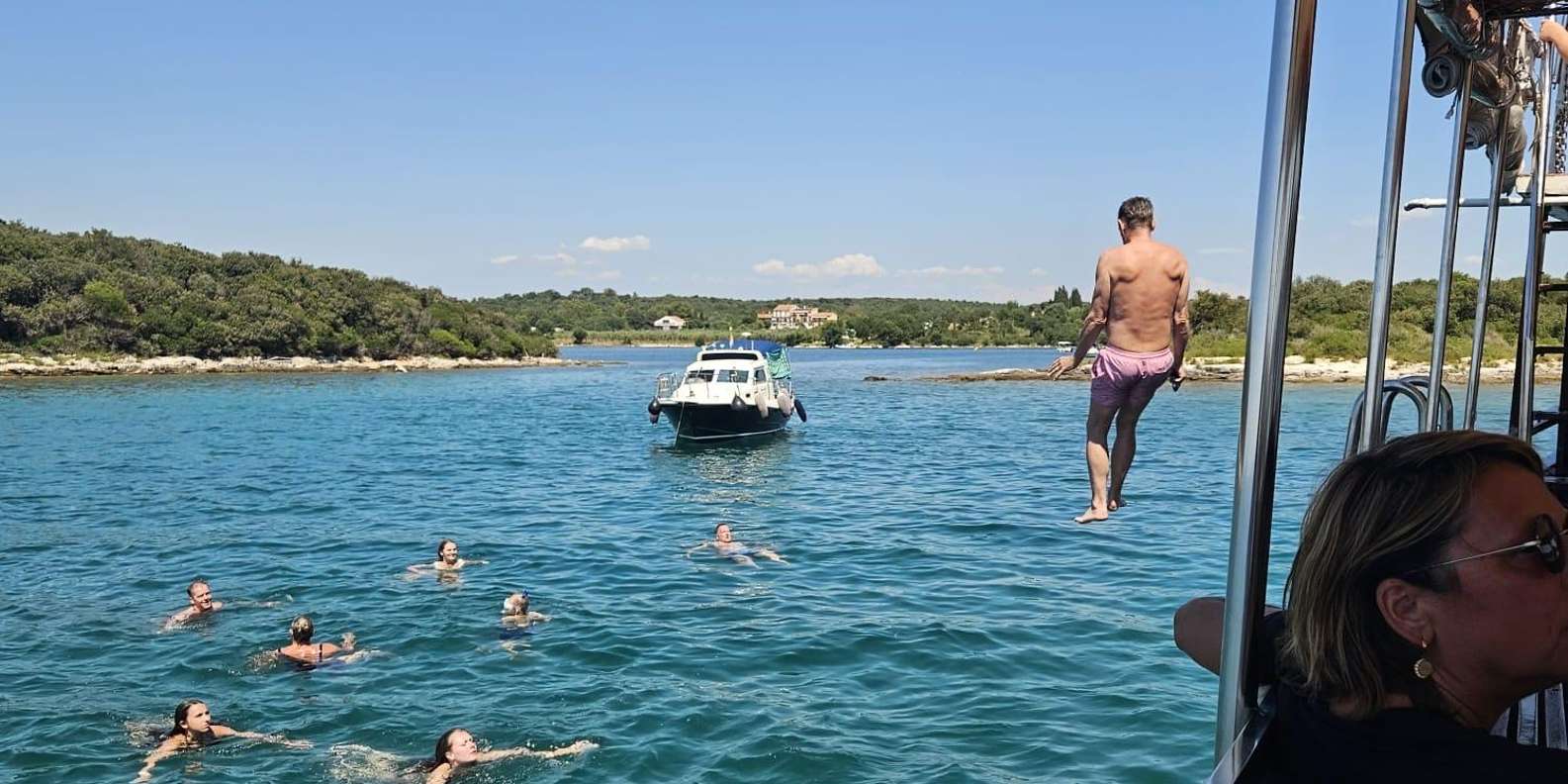 Auf dem Rückweg nach Poreč machen wir direkt vom Boot aus einen Zwischenstopp zum Schwimmen. Du bekommst während der ganzen Fahrt kostenlos lokalen Rakija, Wein, Saft und Wasser. Am frühen Nachmittag geht's zurück nach Poreč – perfekt für einen tollen Morgenausflug auf See.
