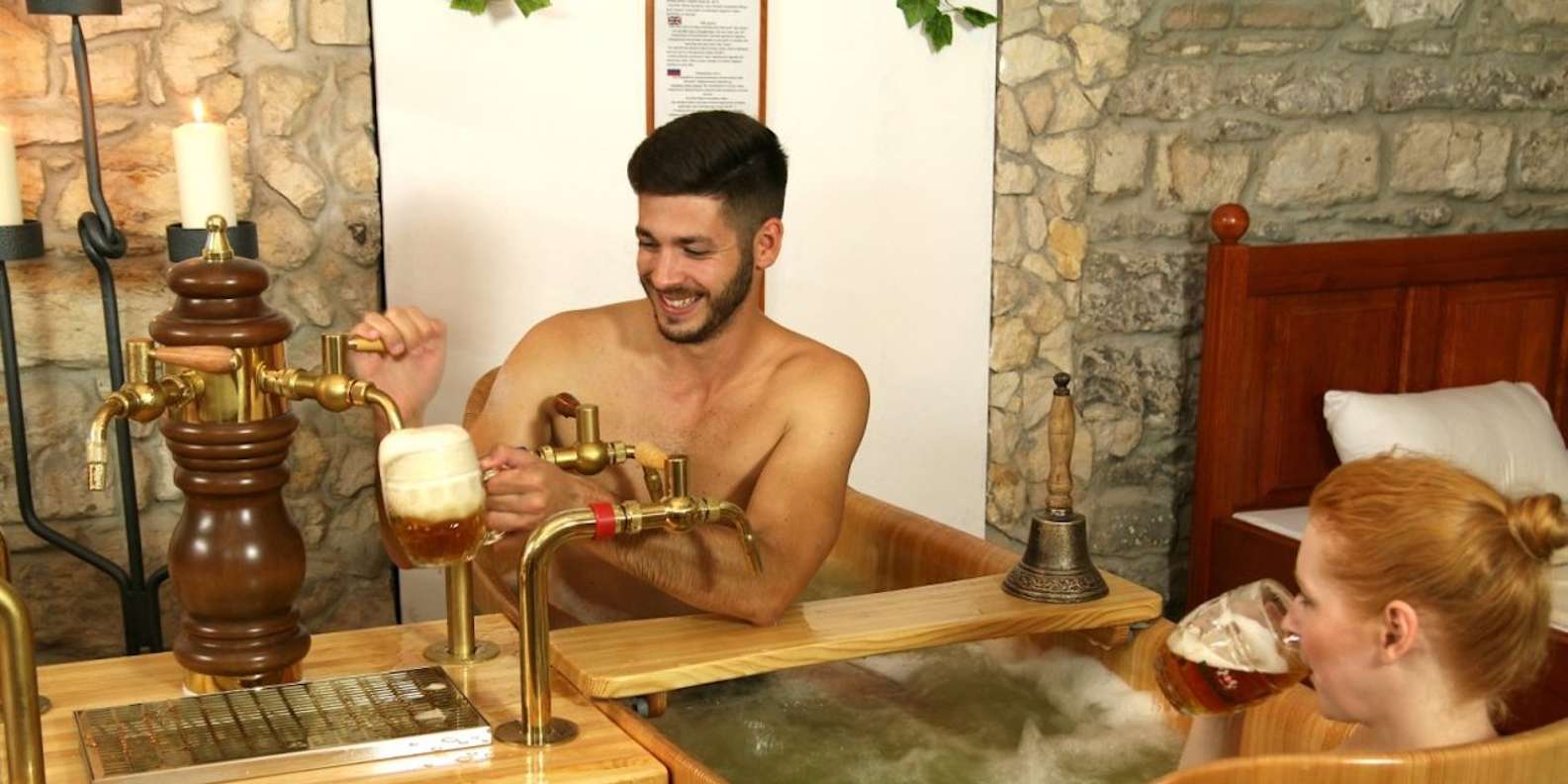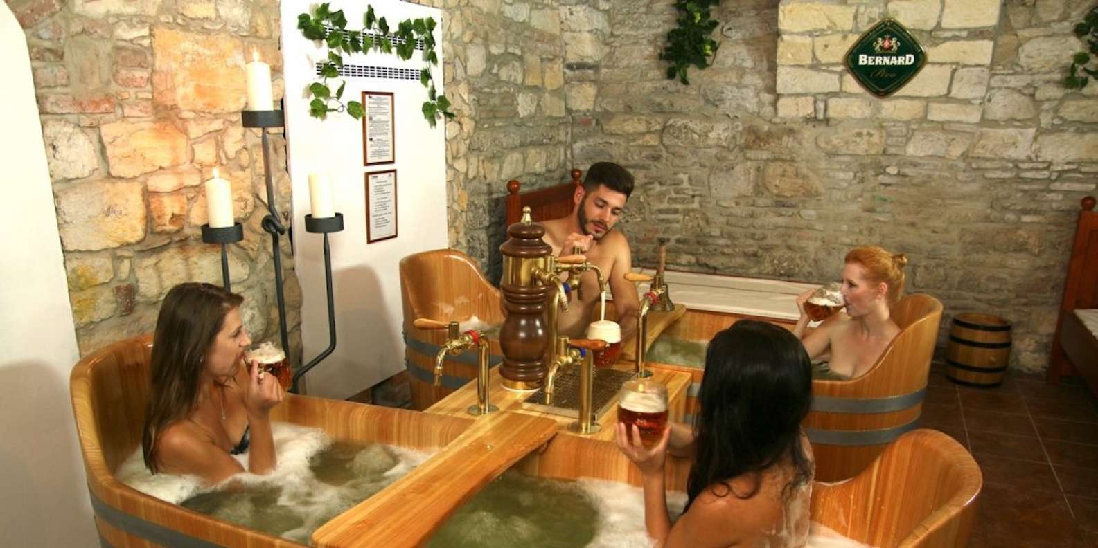 Entspanne dich in einer sprudelnden Wanne mit Bernards berühmtem Bier. Verwöhne dich mit dieser tschechischen Spezialität, die deine Haut weich macht, deinen Geist erfrischt und deinen Durst löscht. G