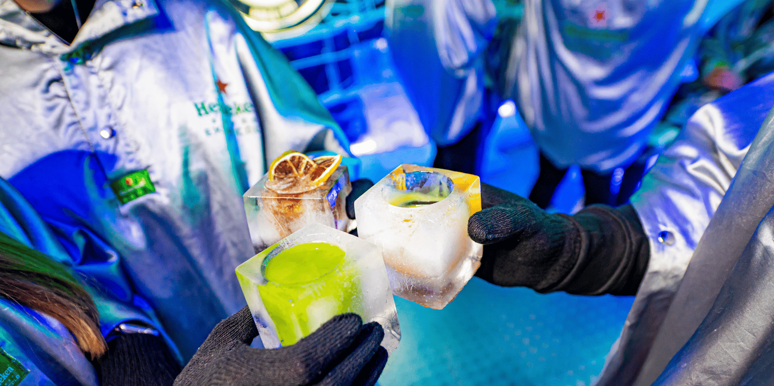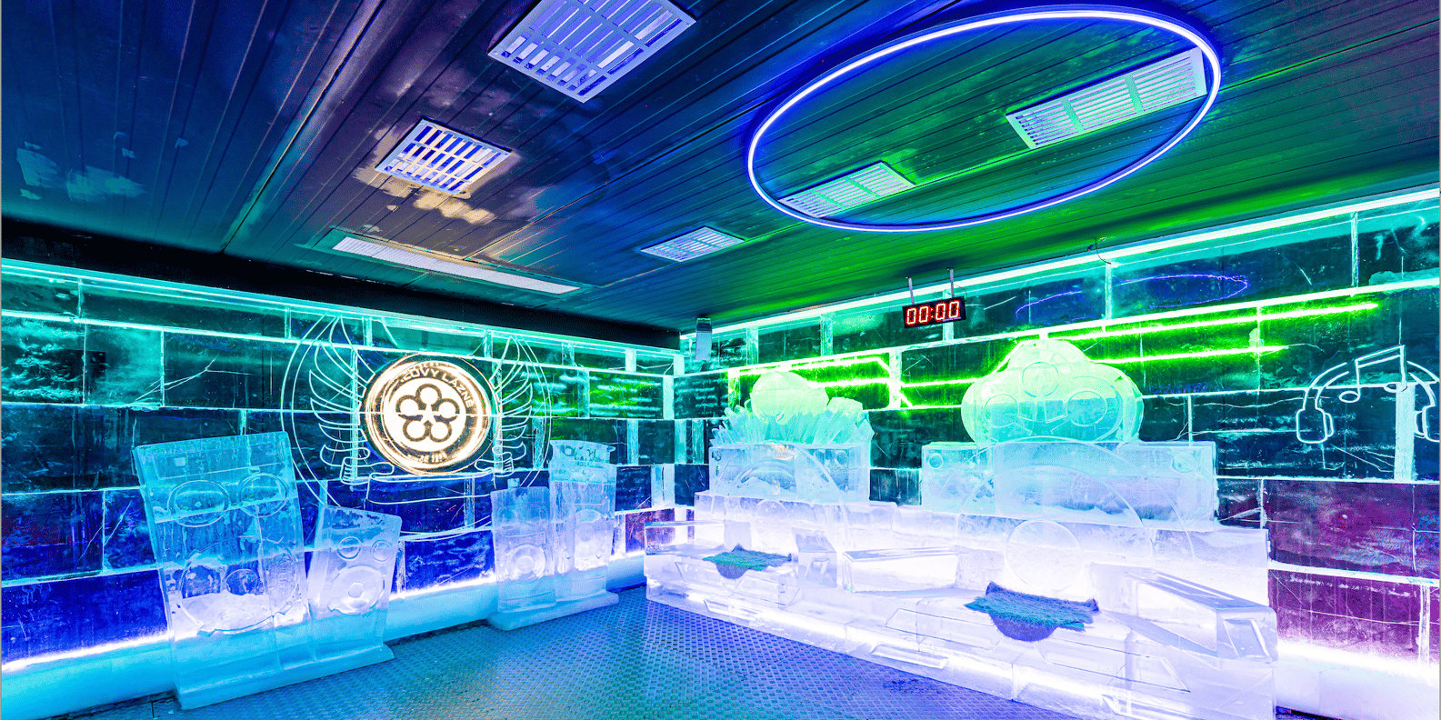 Willkommen im Icepub Prag, wo alles, was du siehst oder berührst, ein eisiges Wunderwerk ist - von den Wänden, der Bar und den Tischen bis hin zu den exquisiten, sorgfältig geschnitzten Skulpturen im