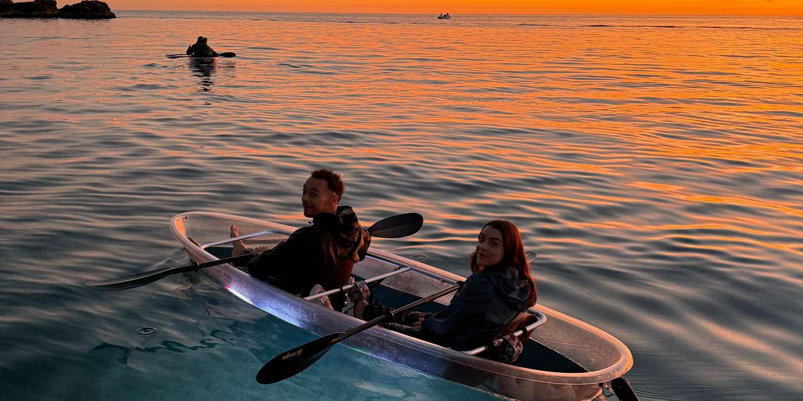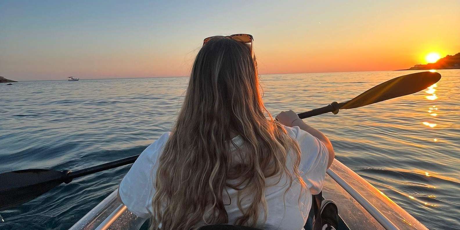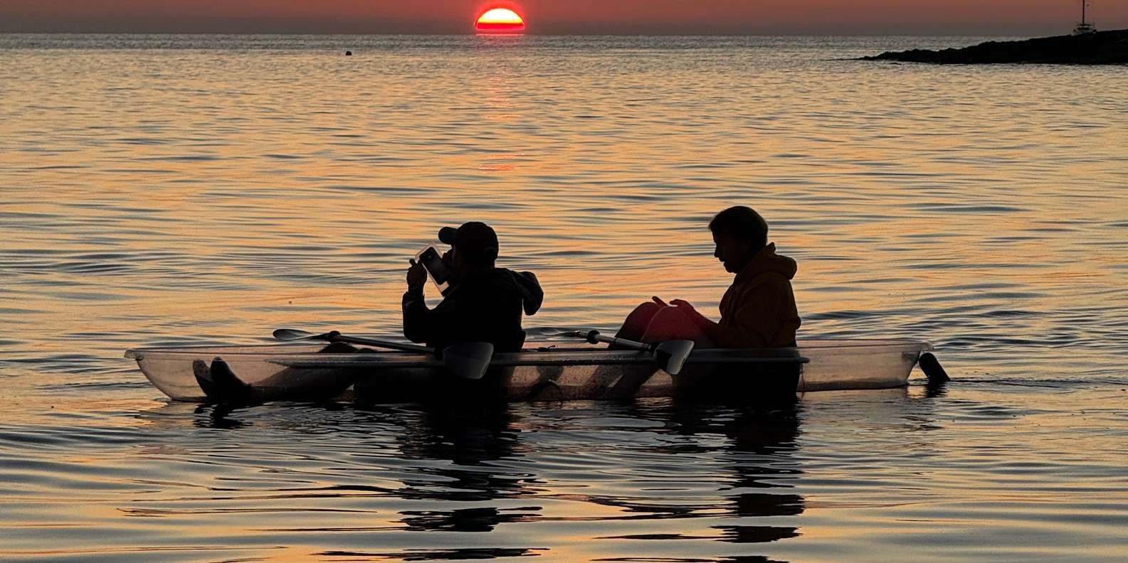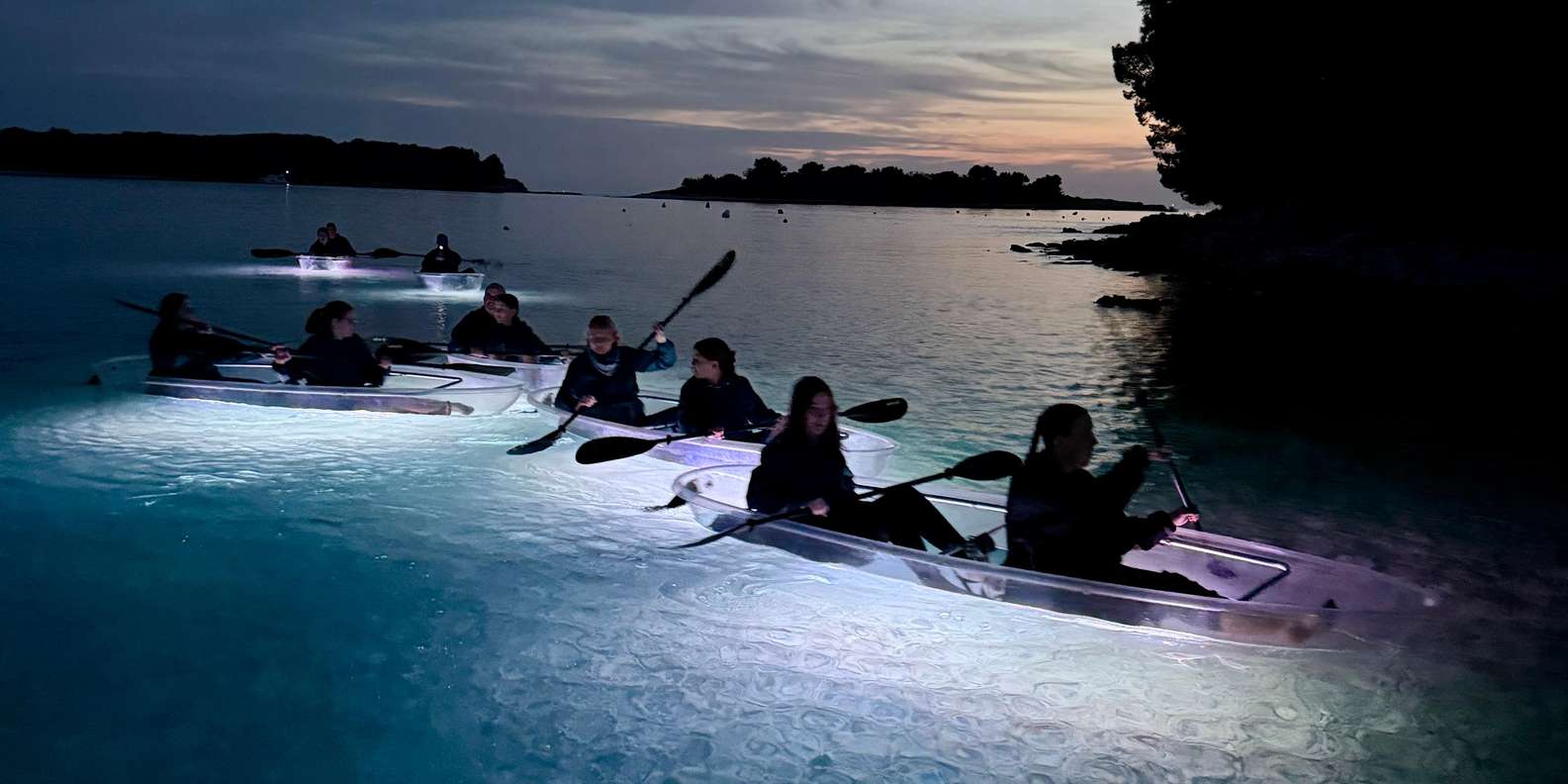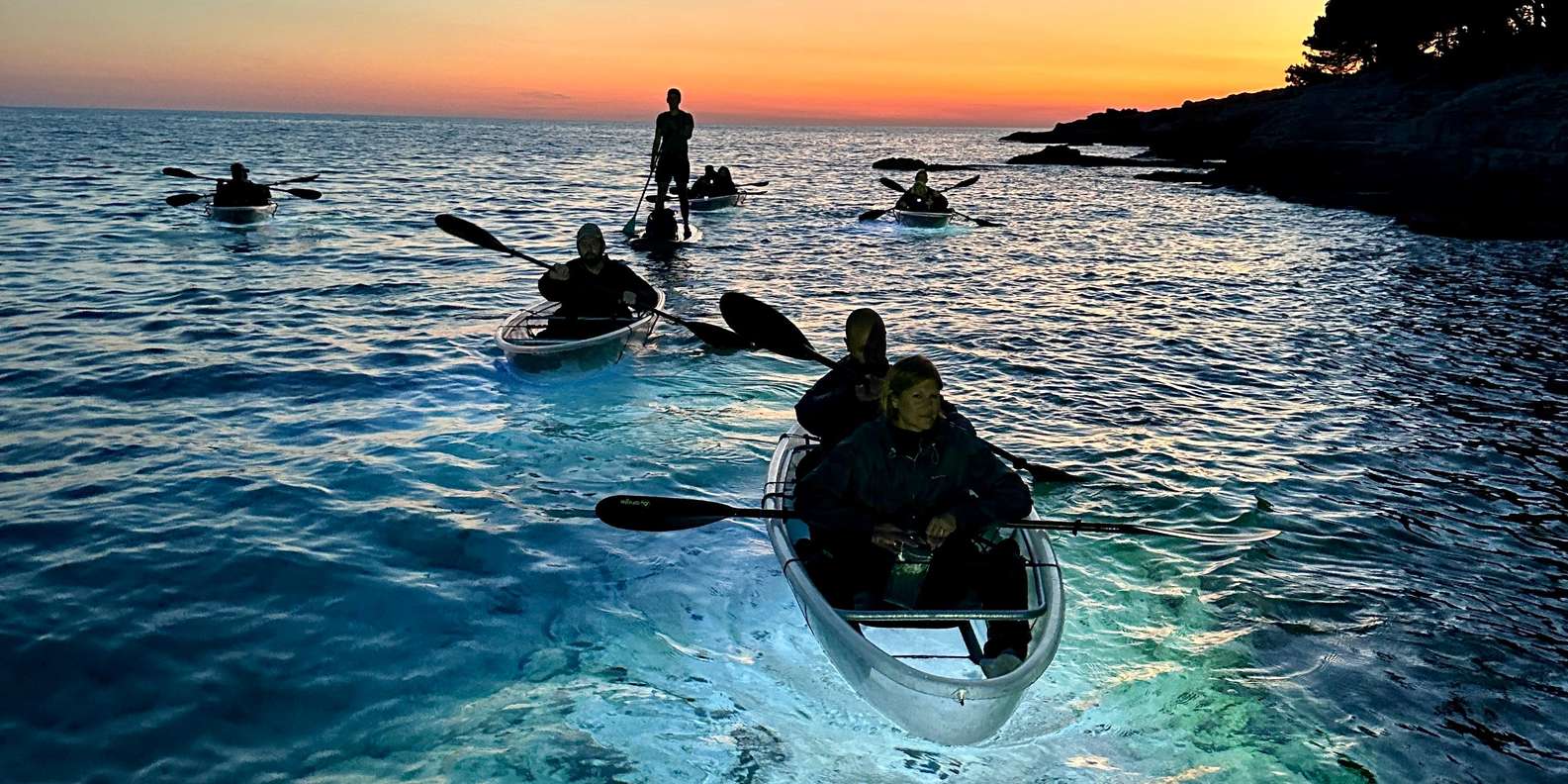 Erleben Sie eine einzigartige geführte Kajak-Tour auf dem Meer in einem Glasboden-Kajak, die bei Sonnenuntergang bis in die Dämmerung dauert. Schauen Sie durch den mit LED-Lichtern beleuchteten Boden des transparenten Kajaks und bewundern Sie die Unterwasserwelt der Adria.