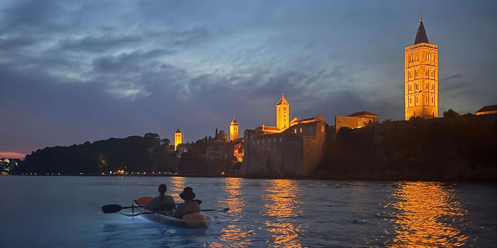 Wenn das Tageslicht verblasst, wird das Erlebnis noch magischer. Sanfte Unterwasserlichter werden eingeschaltet und beleuchten den Meeresboden unter deinem Kajak. Das Meer beginnt in Blau- und Türkistönen zu leuchten und enthüllt verborgene Details der Unterwasserwelt. Gleichzeitig verwandelt sich die Altstadt von Rab in einen leuchtenden alten Hafen. Auf dem Rückweg kannst du die Milliarden von Sternen und die Milchstraße über deinem Kopf sowie das leuchtende Plankton unter deinem Kajak beobachten.
