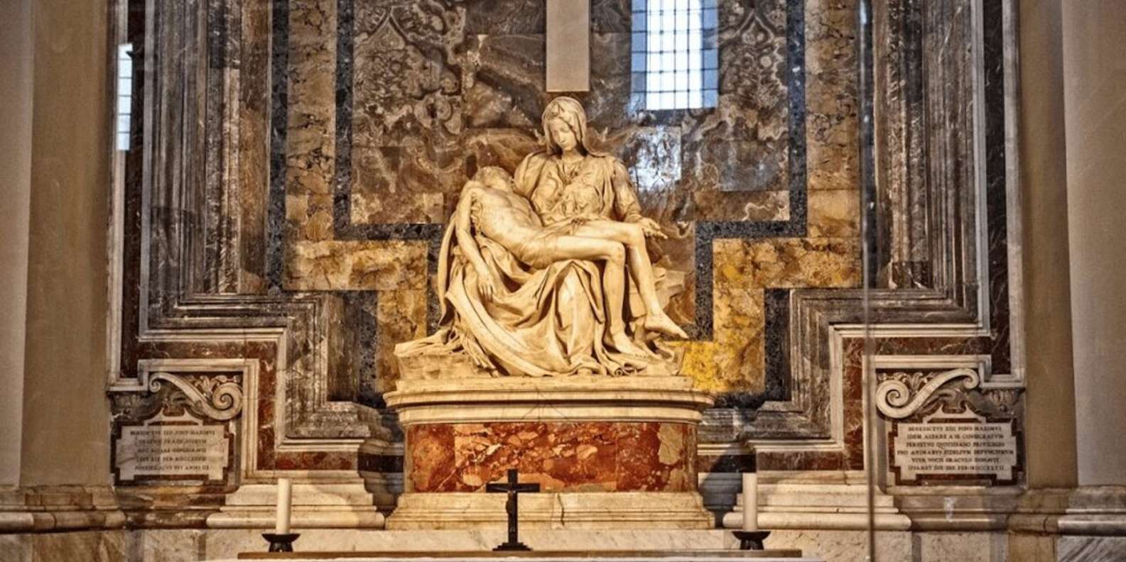 Zum Schluss führt dich dein Guide zum Petersdoms monolithischen Eingang und verabschiedet sich von dir. In Gesellschaft deiner eigenen Gedanken betrittst du den Petersdom, wo du die von Michelangelo entworfene Domkuppel und mehrere weltberühmte Kunstwerke wie Michelangelos „Pietà“ und Berninis riesige Bronzeskulptur „Baldachin“ sehen kannst, die sich über dem Hauptaltar befindet, wo sich das mutmaßliche Grab des Heiligen Petrus befindet.