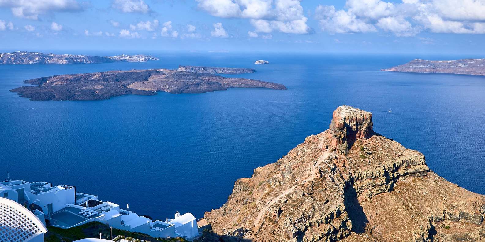 Besuche anschließend Imerovigli, das dank seiner erhöhten Lage und der dramatischen vulkanischen Aussicht oft als „Balkon zur Ägäis“ bezeichnet wird. Von hier aus genießt du einen malerischen, 40-minütigen Spaziergang am Rande der Caldera zurück nach Fira, durch das friedliche Dorf Firostefani, das sich perfekt eignet, um Postkartenwürdige Panoramen ohne Menschenmassen einzufangen.