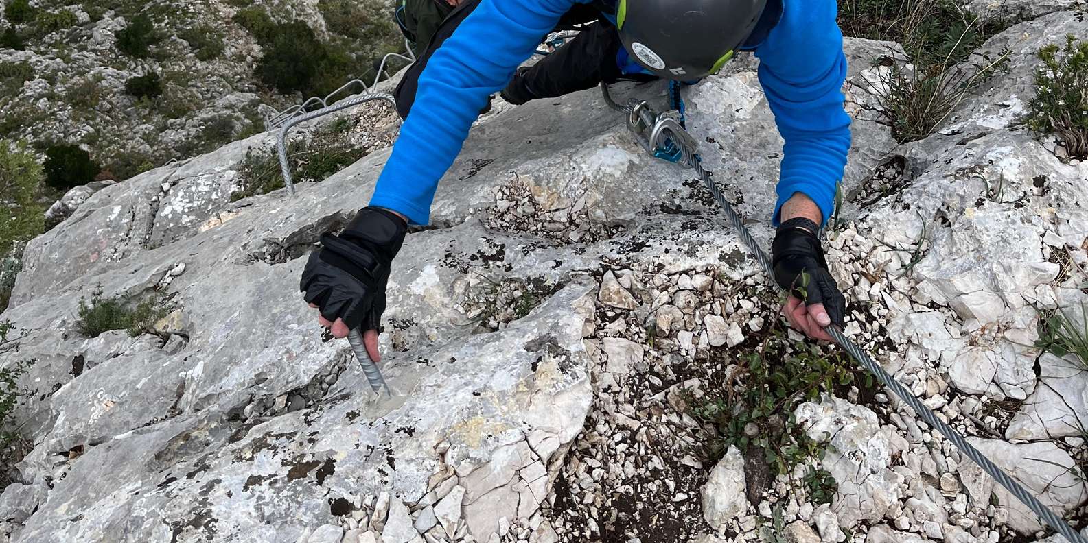 - Via Ferrata ist eine gesicherte Kletterroute mit Eisenkabeln, Sprossen und Leitern.