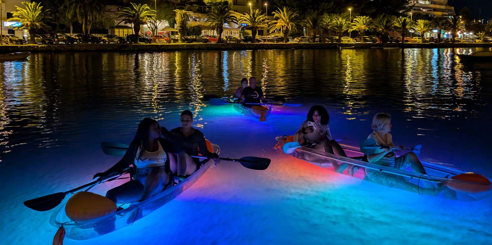 Erlebe ein einzigartiges Kajakabenteuer in der Stille des Abends. Fahre in einem beleuchteten, transparenten Kajak auf die Adria hinaus und bewundere die leuchtenden Farben auf dem Wasser, während du sie erkundest.