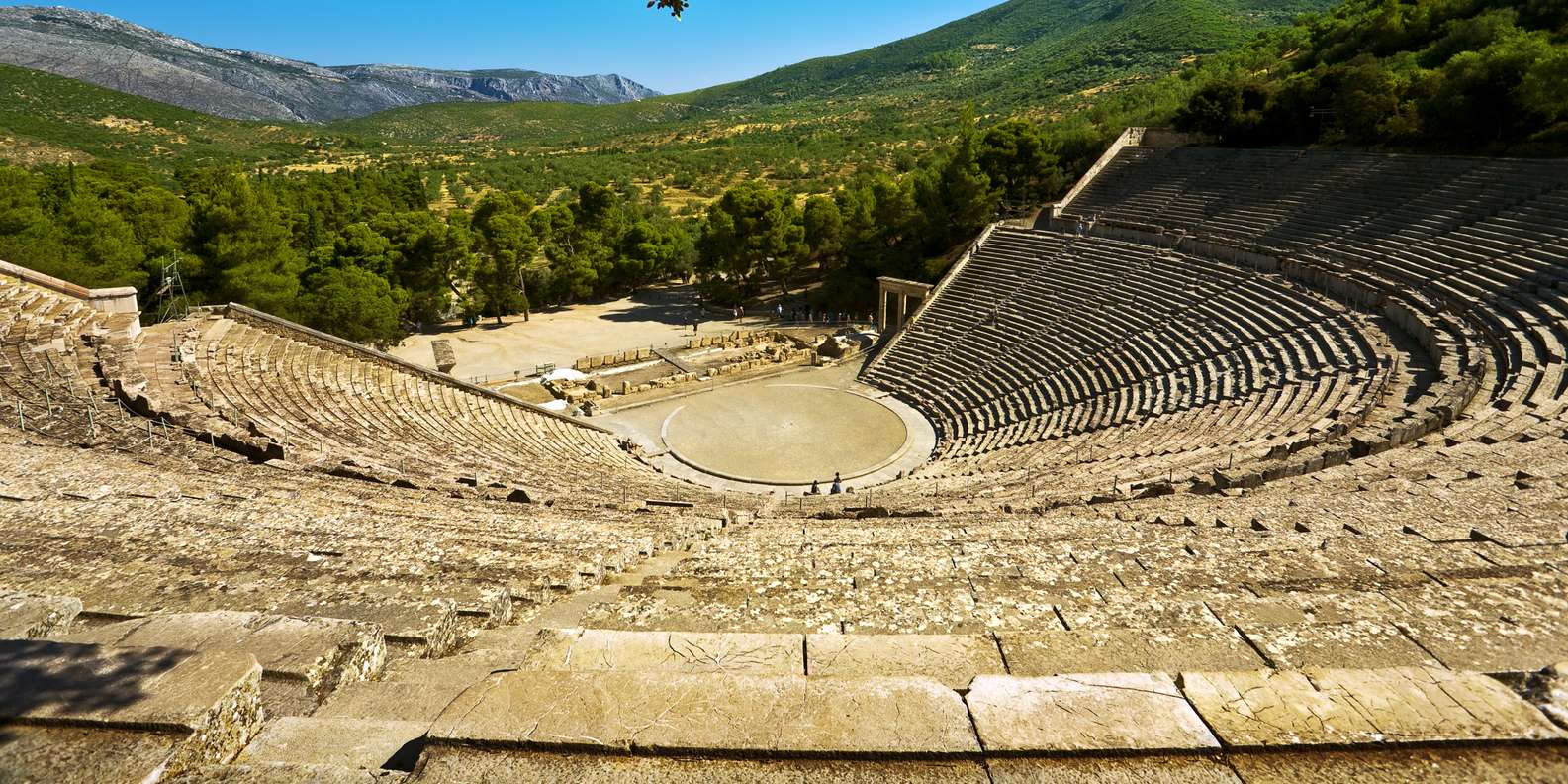 Weiter geht es zum antiken Theater von Epidaurus, einem Theater aus dem 4. Jahrhundert, das eines der am besten erhaltenen klassischen griechischen Bauwerke ist. Es ist für seine erstaunliche Akustik bekannt; eine Münze, die in der Mitte des Theaters fällt, kann vom höchsten Sitz aus gehört werden. Das Theater bietet Platz für bis zu 14.000 Menschen und sein Eingang wird von restaurierten korinthischen Pilastern flankiert. Heute wird es während des jährlichen Hellenic Festivals für Aufführungen antiker griechischer Dramen genutzt.
