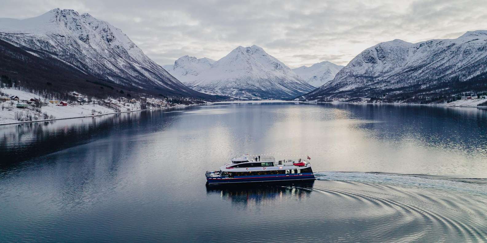 Genieße den Anblick der Stadt Tromsø und der Arktischen Kathedrale, während du in Richtung der arktischen Fjorde segelst. Entdecke spektakuläre Landschaften, darunter Inseln, charmante Dörfer und schn