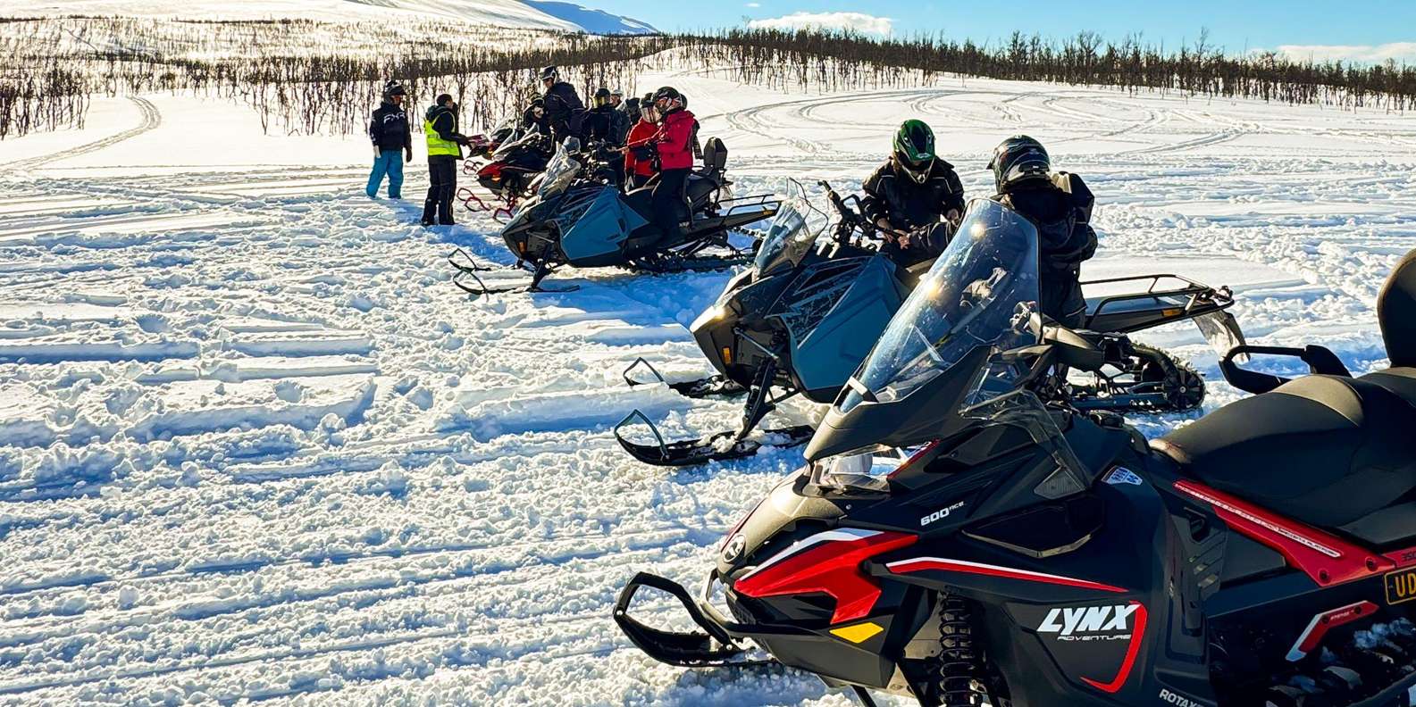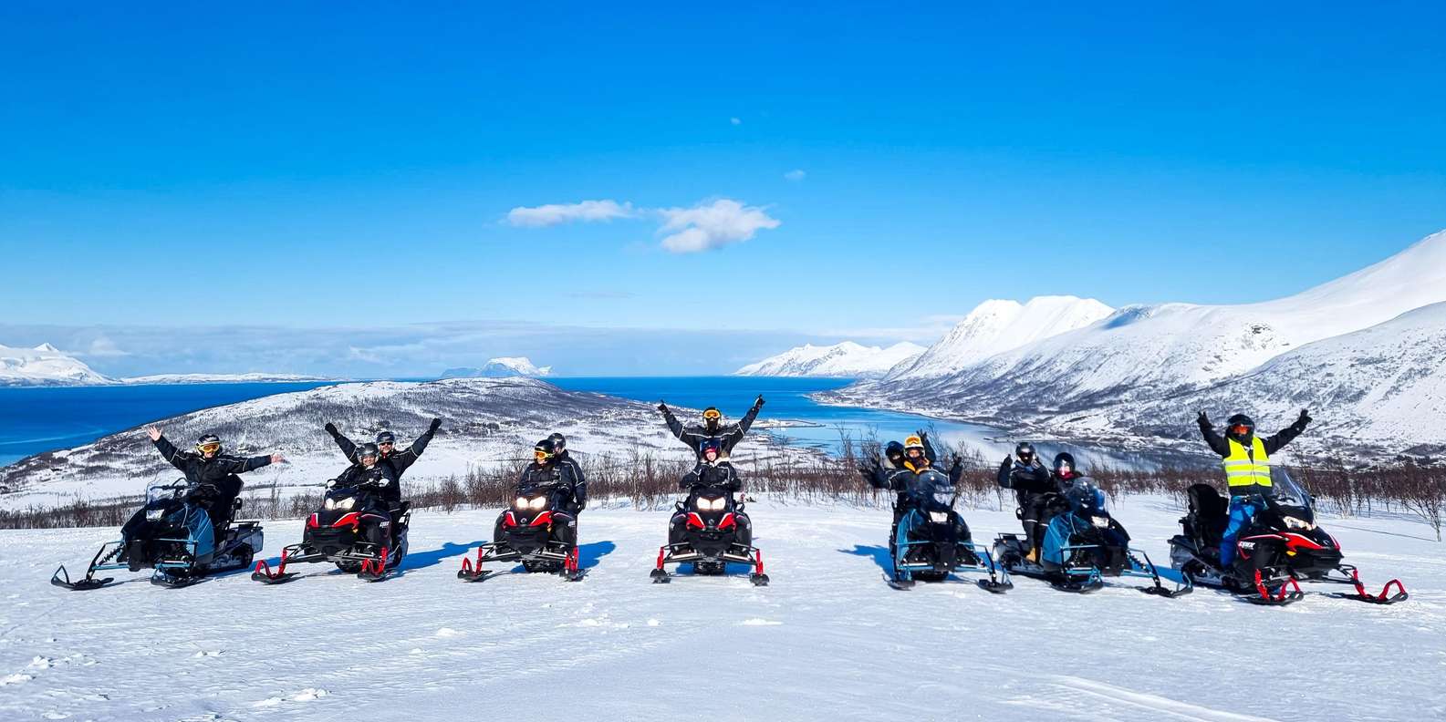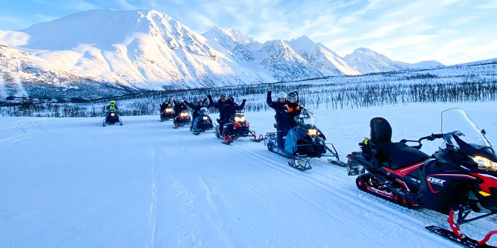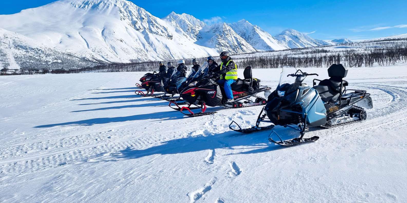 Wir fahren in einer Reihe, im Safari-Stil, auf genehmigten und gut ausgebauten Wegen. Sicherheit hat für uns oberste Priorität, und wir bleiben immer auf den ausgewiesenen Wegen. Das Gelände ist abwechslungsreich, liegt in einer Bergregion und bietet unterwegs lustige und aufregende Fahrherausforderungen. Die Tour konzentriert sich auf Sehenswürdigkeiten, Fotostopps, den Nervenkitzel des Schneemobilfahrens und die einzigartige Umgebung von Bergen, Wäldern und Fjorden.