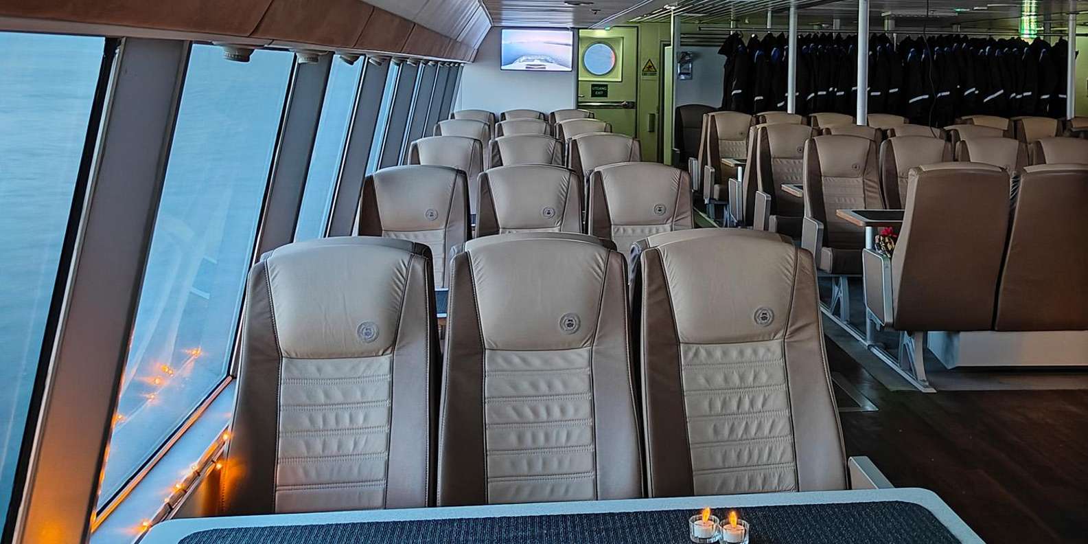 Das Boot, MS Gabriele, ist ein warmer und komfortabler Katamaran mit Sitzplätzen für jeden Passagier. Du kannst die Wale von innen durch große Fenster oder von außen auf einem großen offenen Deck beobachten. Die Bar an Bord bietet warme und kalte Getränke, Snacks und leichte Mahlzeiten.