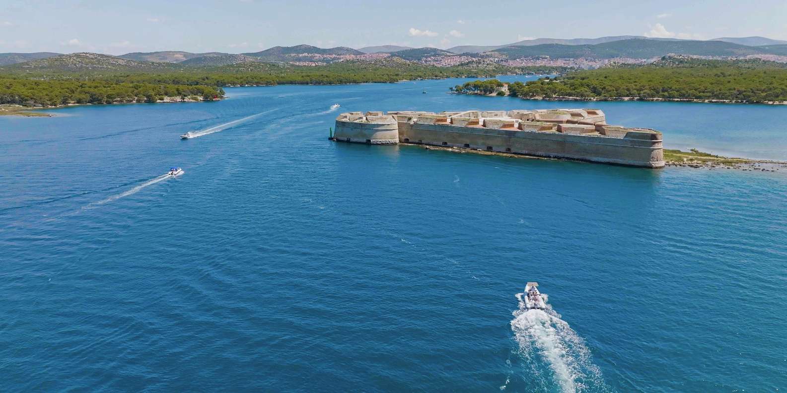 Beginne dein privates Abenteuer in Vodice mit einer malerischen Fahrt durch den Kanal von Å ibenik, der einen atemberaubenden Blick auf die beeindruckende Festung des Heiligen Nikolaus und die historische Stadt Å ibenik bietet.