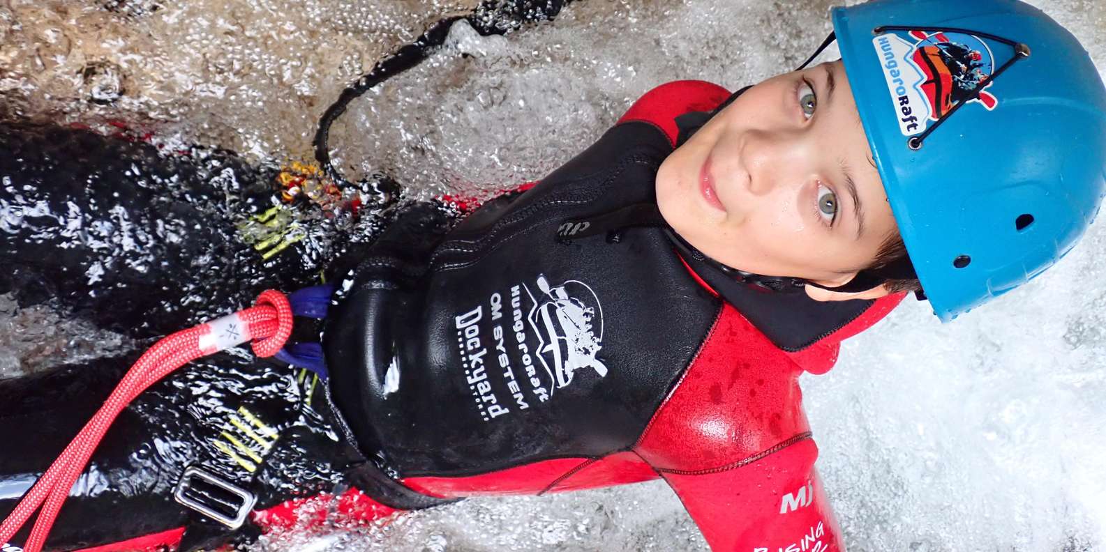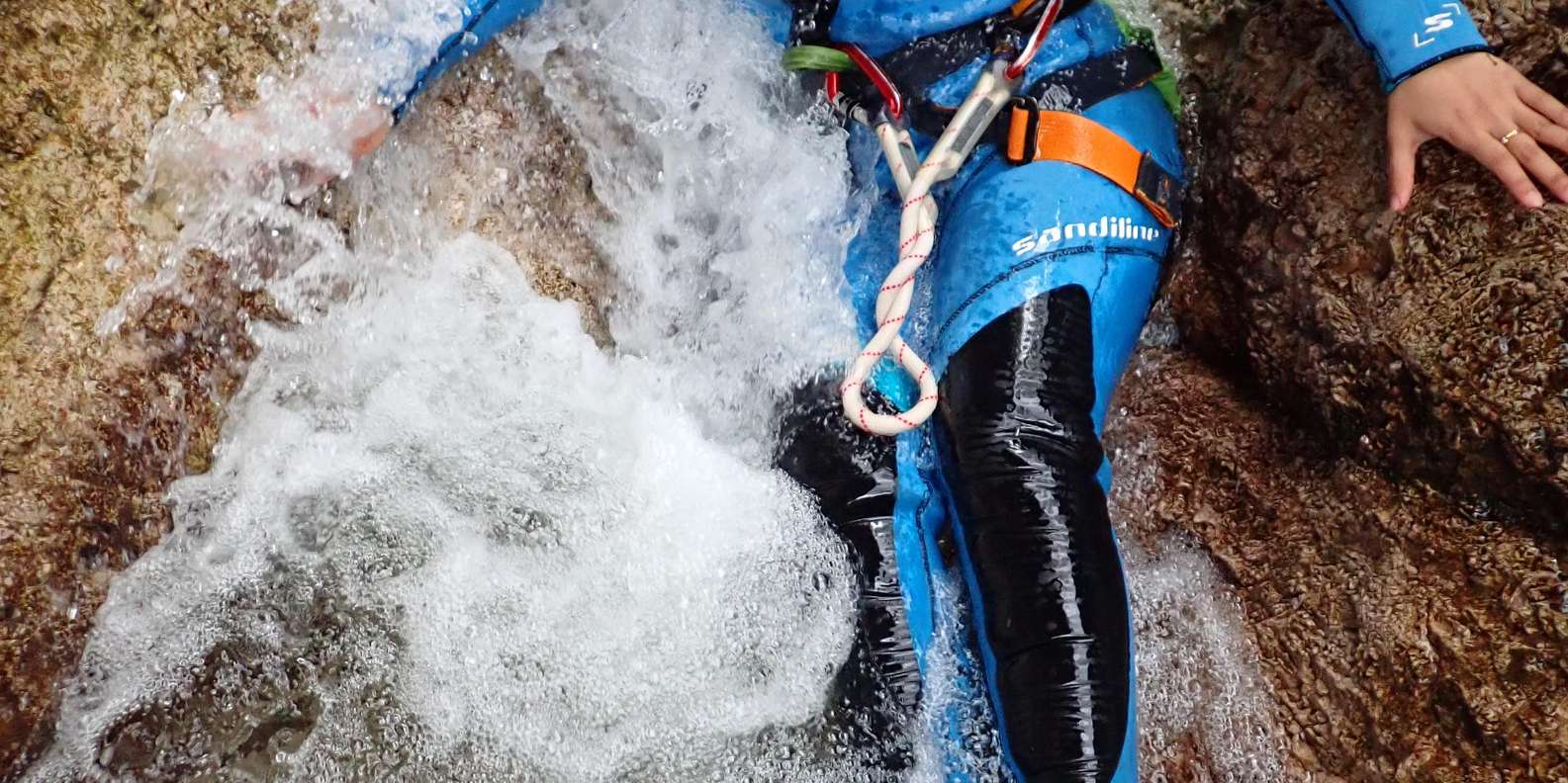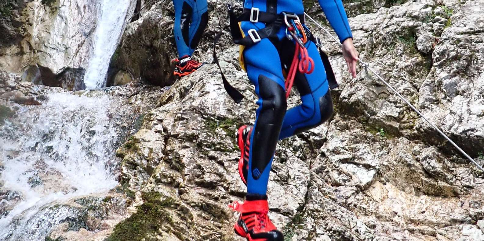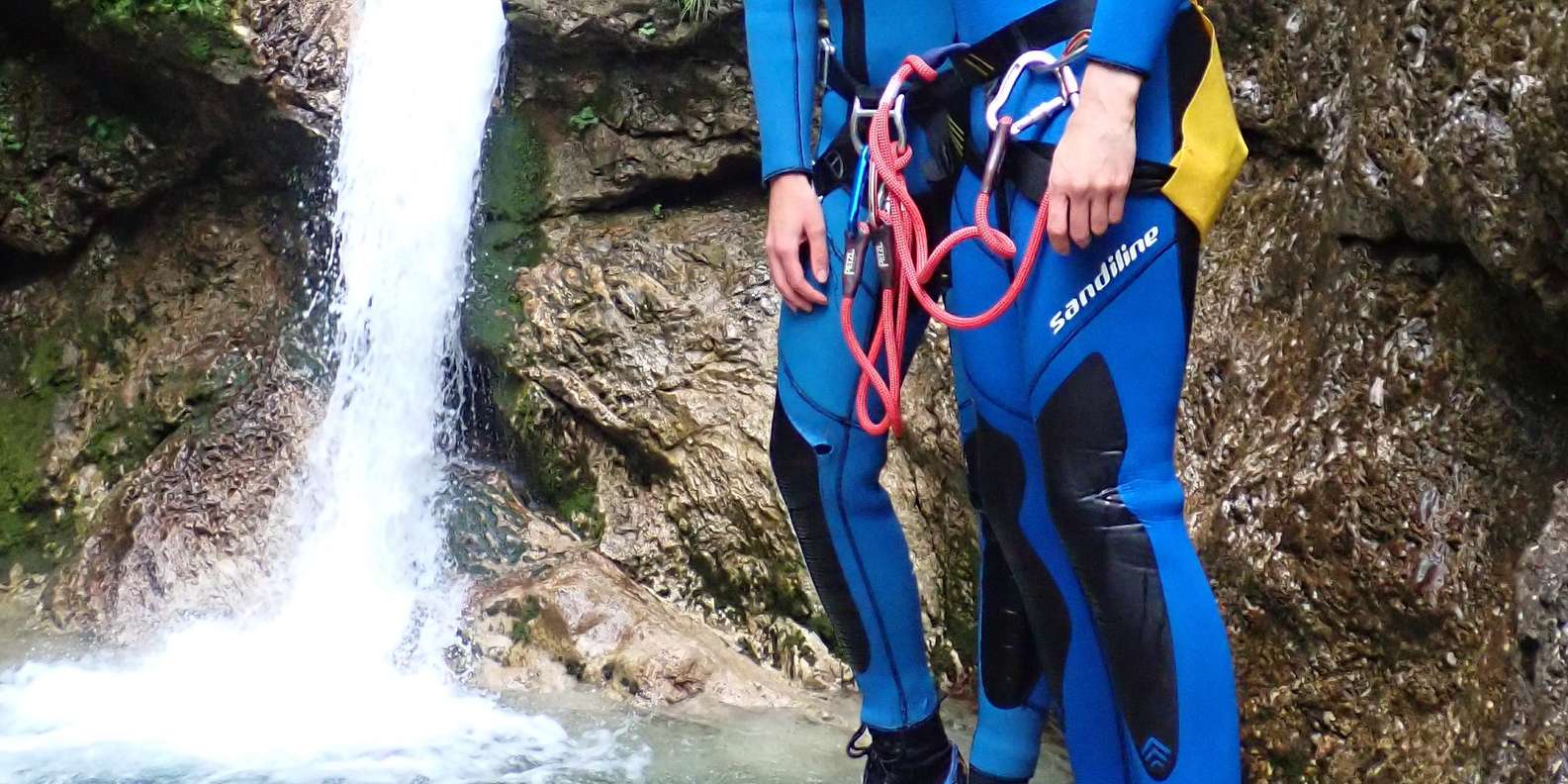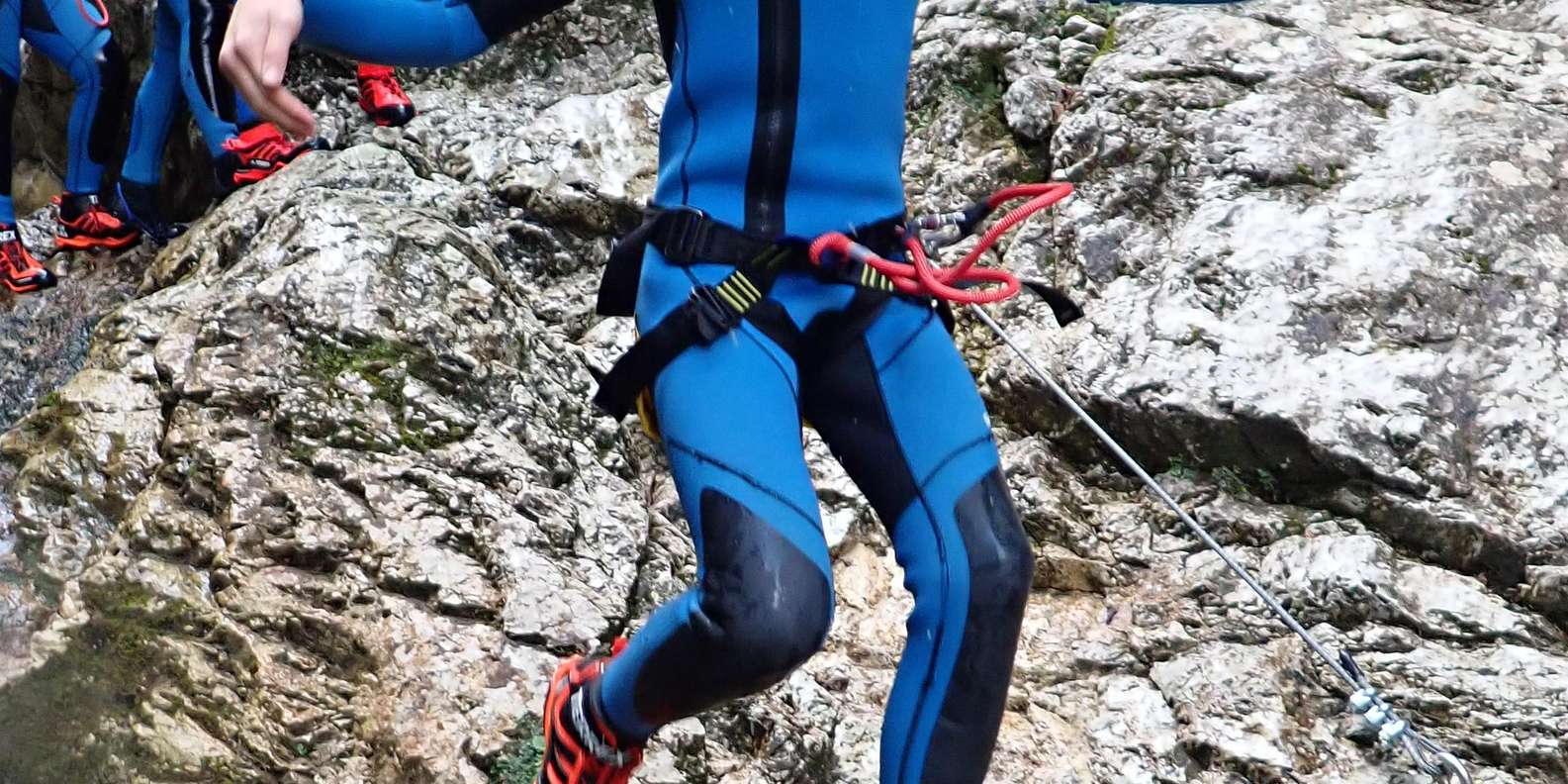 Alle notwendigen Ausrüstungsgegenstände, einschließlich Neoprenanzug, Neoprenstiefel, Helm, Klettergurt oder Rutschhose