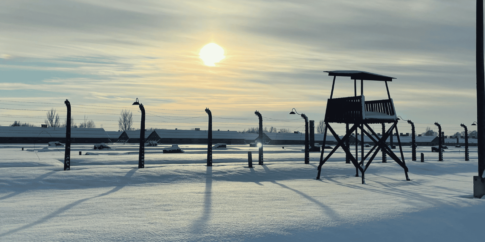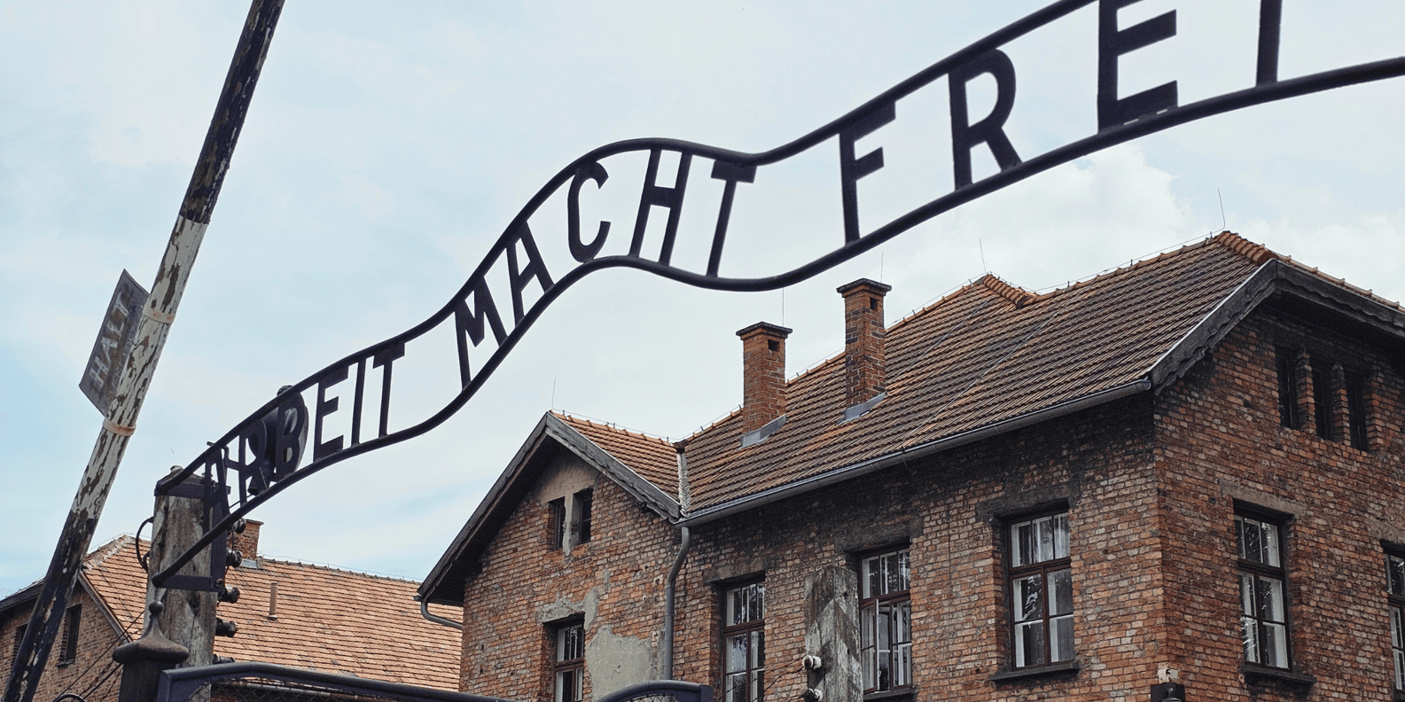 - Sieh dir das Haupttor von Auschwitz mit der Inschrift „Arbeit macht frei” an.