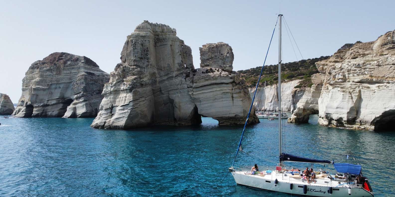 - Die Reiseroute kann je nach Wetterbedingungen oder nach Ermessen unseres Kapitäns Nikos geändert oder storniert werden, um ein komfortables und angenehmes Erlebnis zu gewährleisten: Bei starkem Nordwind wird die Reiseroute so umgeleitet, dass sie in der Bucht „Provatas“ beginnt und endet. Wir fahren direkt nach Kleftiko, um zu den ersten Booten zu gehören, die die Bucht erreichen, fahren weiter zum Strand Tsigrado und erkunden das gesamte Höhlensystem mit unseren Schnorcheln. Zum Abschluss besuchen wir den einzigartigen und unzugänglichen weißen Sandstrand „Gerakas“. Bei starkem Südwind wird die Route auf Adamas – Sarakiniko oder Papafragas Bucht – Polyaigos Insel – Kimolos Insel verlegt