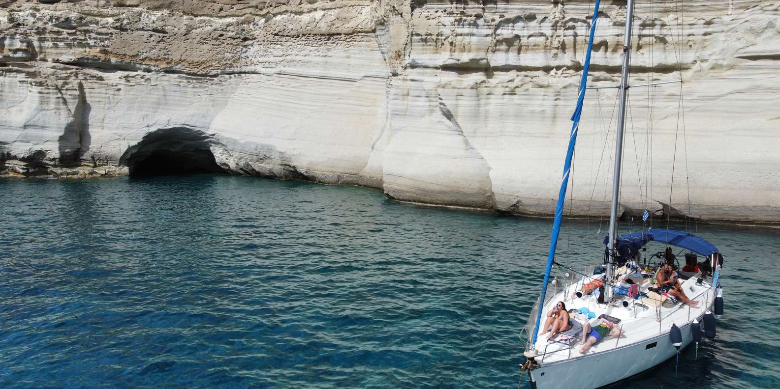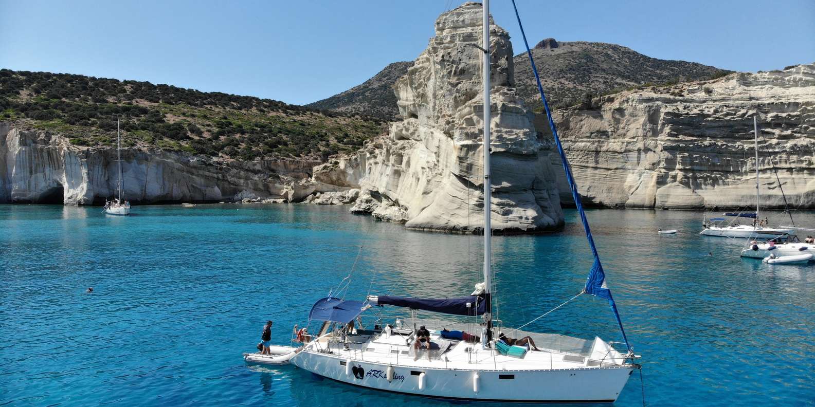 Fahre je nach Wetterlage zur Höhle von Sykia oder erkunde den Strand von Agios Ioannis. Gönn dir ein zweites Bad und genieße deine freie Zeit am Strand, bevor es zur Piratenbucht Kleftiko geht. Hier erwartet dich ein umfangreiches Programm an Aktivitäten: Begleite Nikos auf seinem Beiboot zu aufregenden Abenteuern und erkunde alle Höhlen, Risse und Tunnel der Bucht. Zurück auf dem Segelboot kannst du im kristallklaren Wasser schwimmen und schnorcheln, auf einer Schwimmnudel herumtreiben, dich an Deck inmitten der atemberaubenden Landschaft entspannen und ein von Marion an Bord zubereitetes griechisches Mittagessen genießen, zu dem unbegrenzt alkoholische und alkoholfreie Getränke gehören.