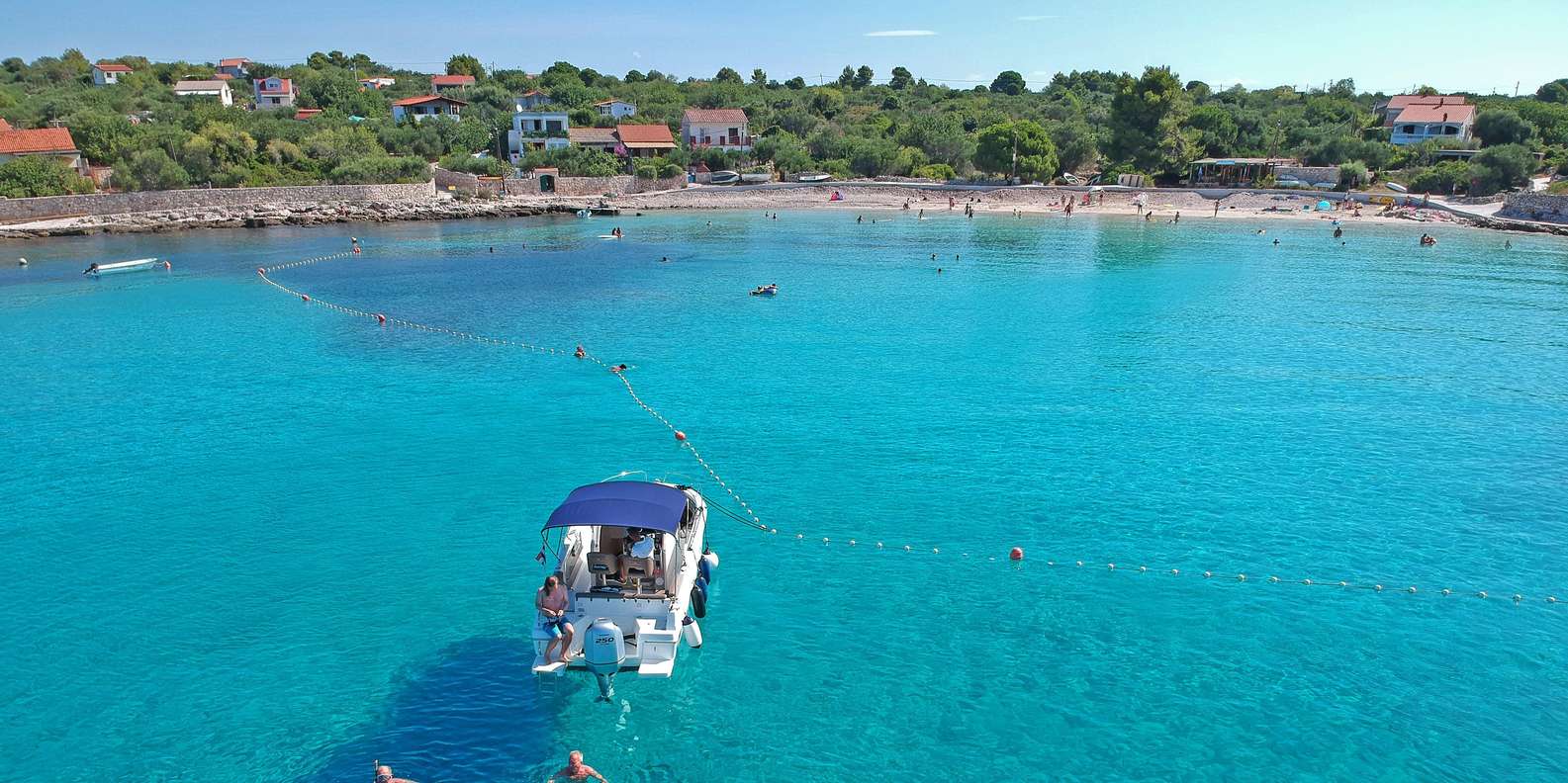 Als Nächstes besuchen Sie die weltberühmte Blaue Lagune, einen der schönsten Orte zum Schwimmen und Schnorcheln in Kroatien. Das kristallklare Wasser ist perfekt zum Schnorcheln, Schwimmen oder einfach nur zum entspannten Treiben lassen. Für alle, die es vorziehen, bei einem kühlen Getränk zu entspannen und dabei die Sonne und die idyllische Umgebung zu genießen, steht eine Strandbar mit Liegestühlen zur Verfügung.