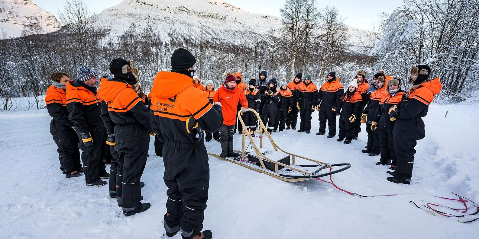 Zur Vorbereitung auf die Hundeschlittenfahrt wird die erste Gruppe mit der notwendigen Ausrüstung wie Thermoanzügen, Stiefeln und Handschuhen ausgestattet, um Komfort und Wärme für das bevorstehende Abenteuer zu gewährleisten. Nach den Vorbereitungen und der notwendigen Einweisung in die Steuerung des Schlittens geht es auf die Hundeschlittenfahrt.
