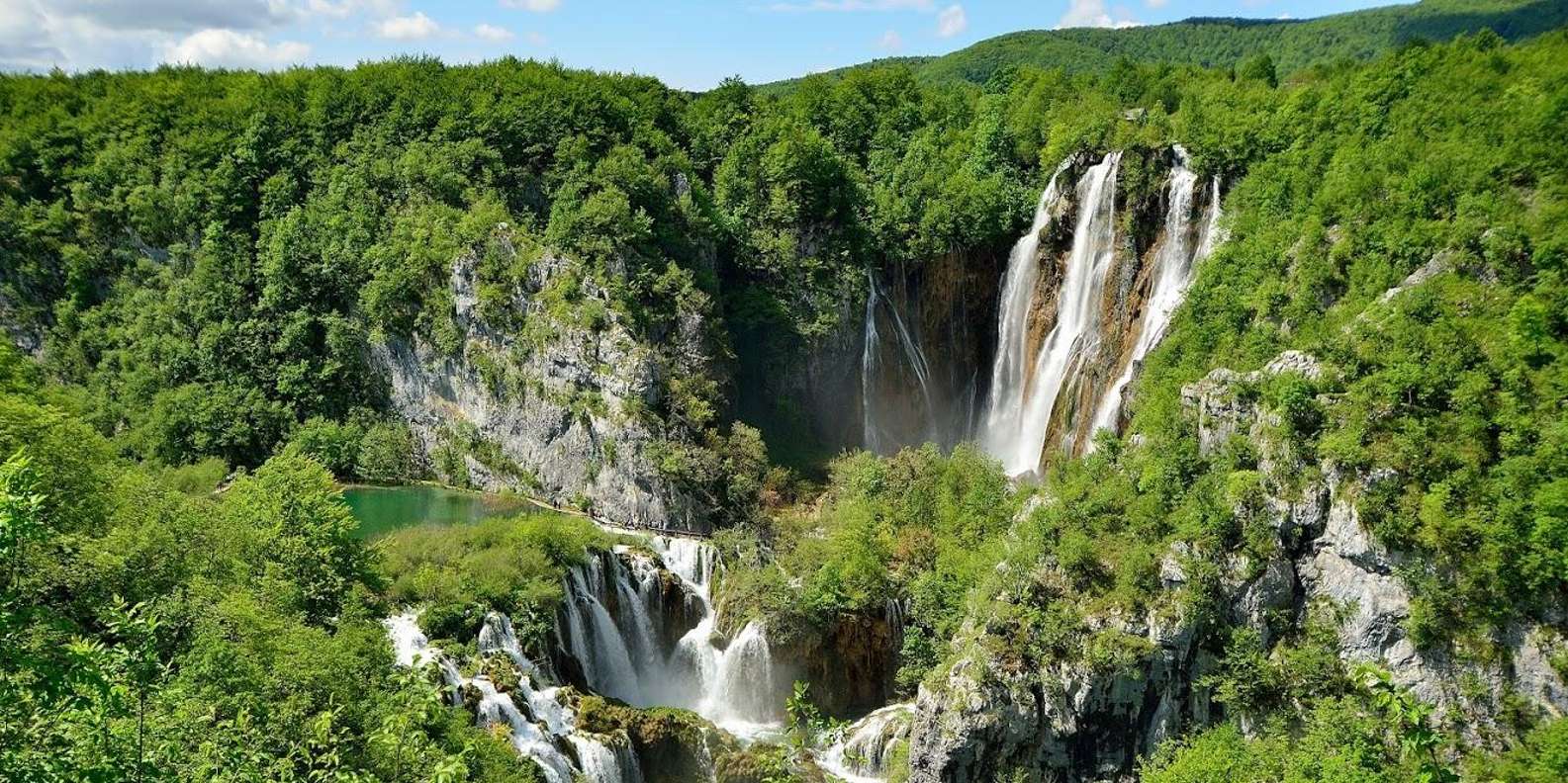 In Begleitung eines professionellen Guides genießt du eine 8,5 km lange Wanderung auf Holzwegen, ergänzt durch eine entspannte Bootsfahrt und eine Panoramazugfahrt. Bestaune das atemberaubende Schauspiel von 16 kristallklaren Seen, die ineinander übergehen, umgeben von üppigen Wäldern und dramatischen Wasserfällen.