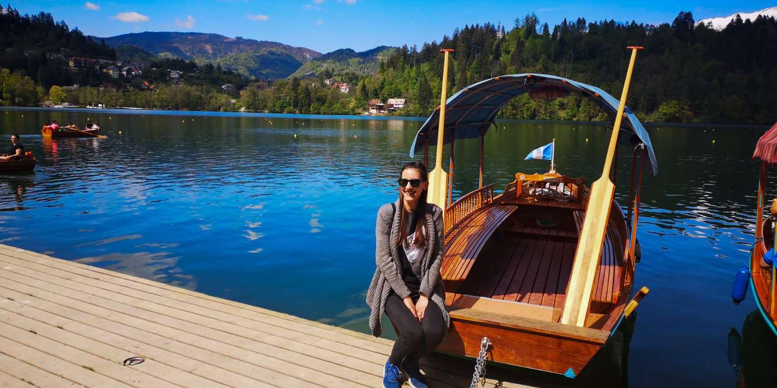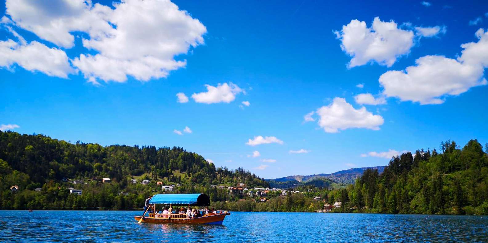 Du kannst eine traditionelle Pletna-Bootsfahrt unternehmen, ein Holzschiff, das von einheimischen Ruderern gerudert wird, deren Können seit Generationen weitergegeben wird.