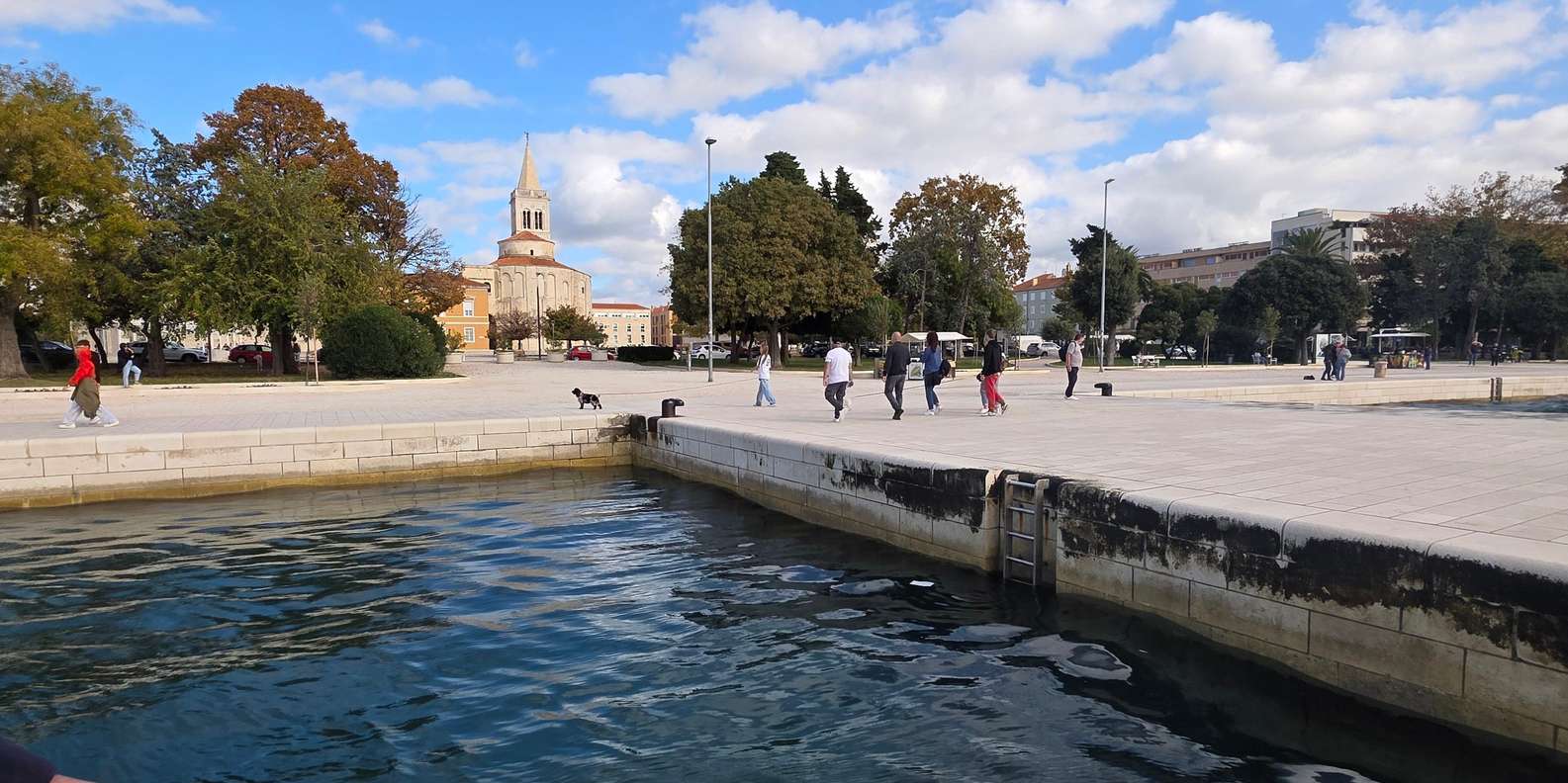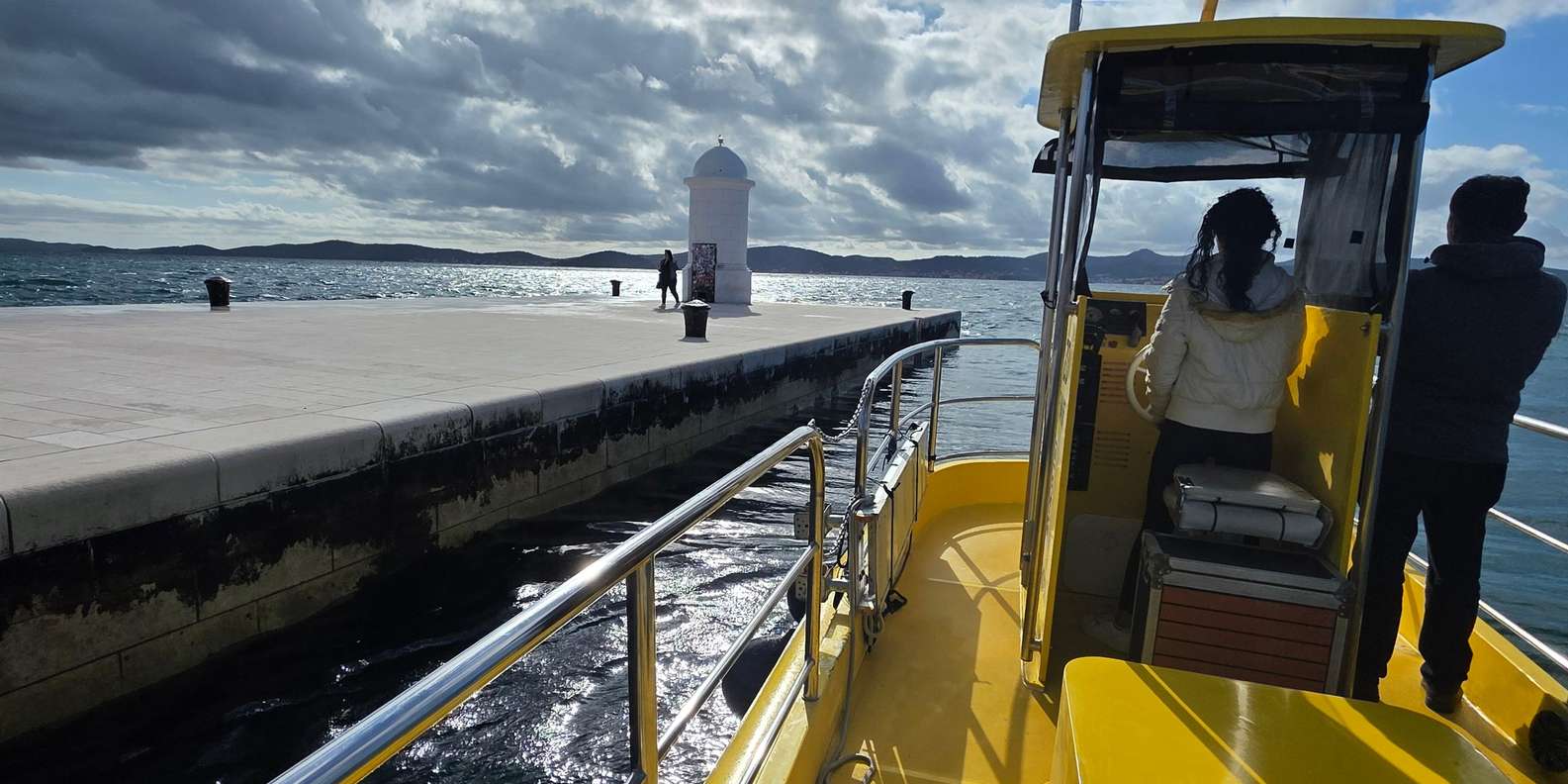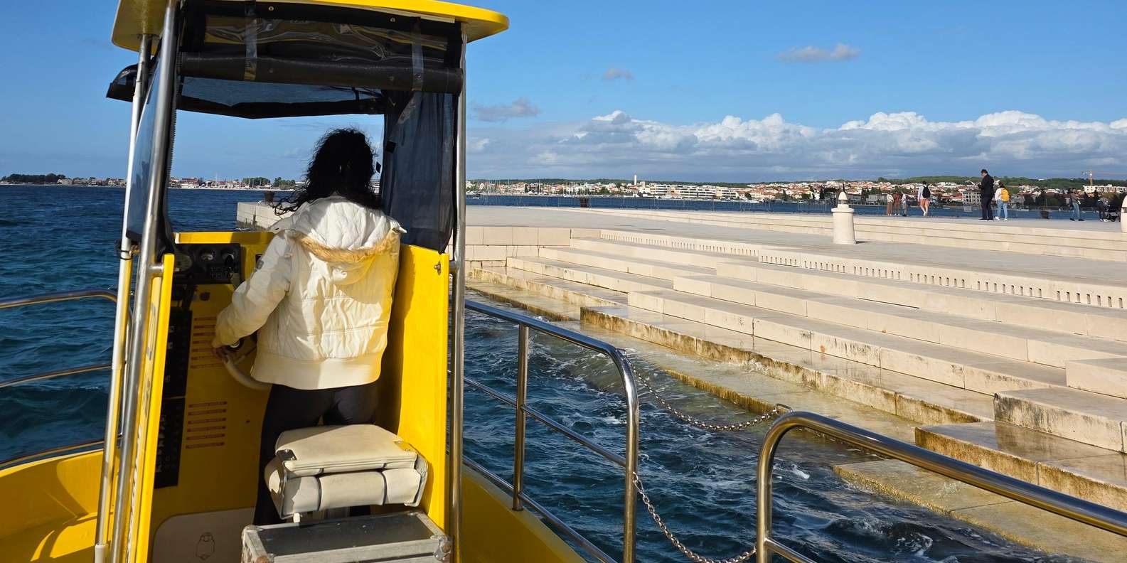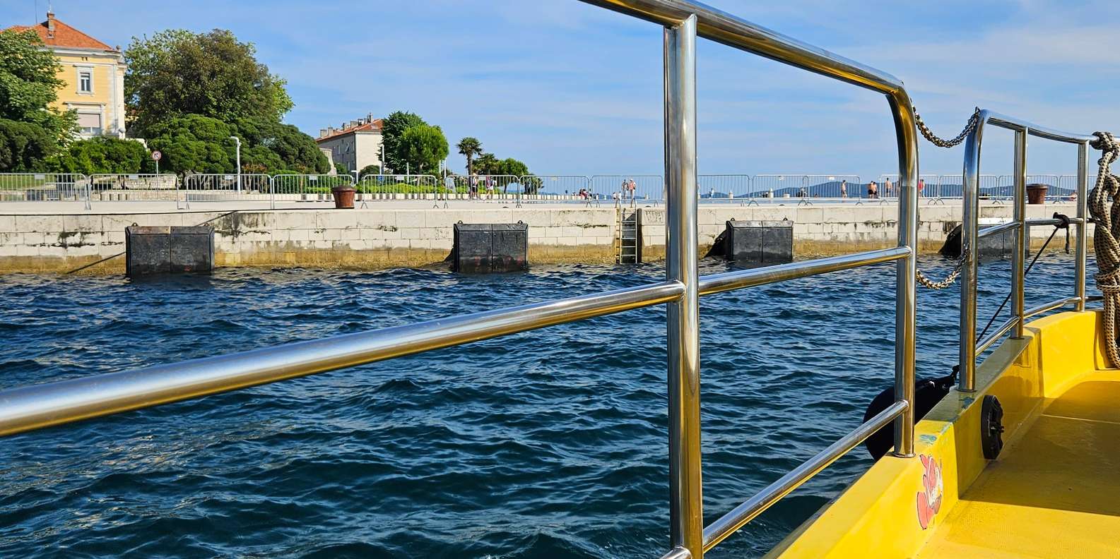 Wenn du möchtest, kannst du wieder auf das Deck klettern und in der Sitzecke bleiben, um den Panoramablick auf die historische Altstadt von Zadar vom Wasser aus zu genießen.