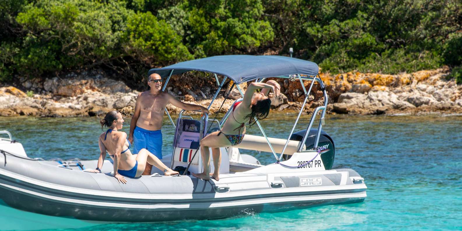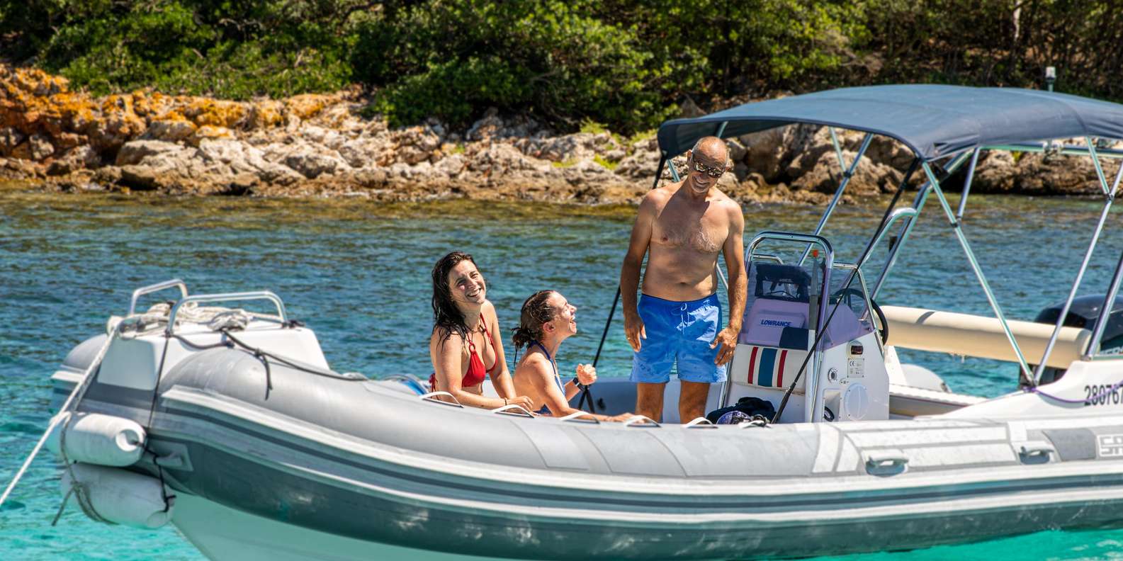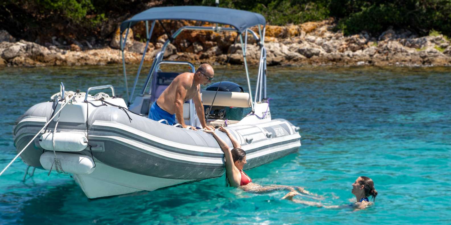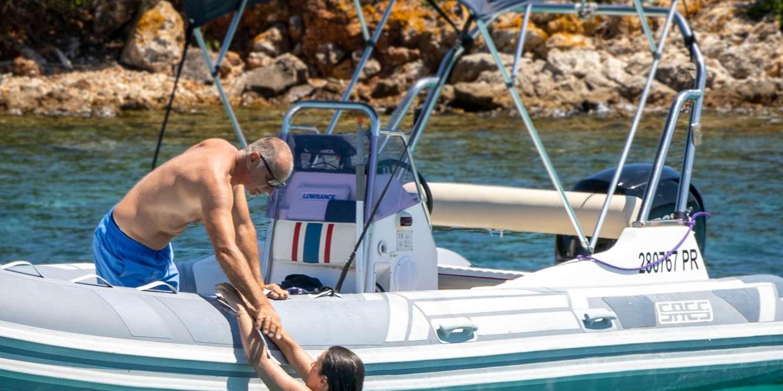 Führung mit erfahrenem Skipper Bequemes Schlauchboot mit Sonnenschutz, Liegefläche, Kühlschrank und Musikanlage Kalte Getränke an Bord Schnorchelausrüstung