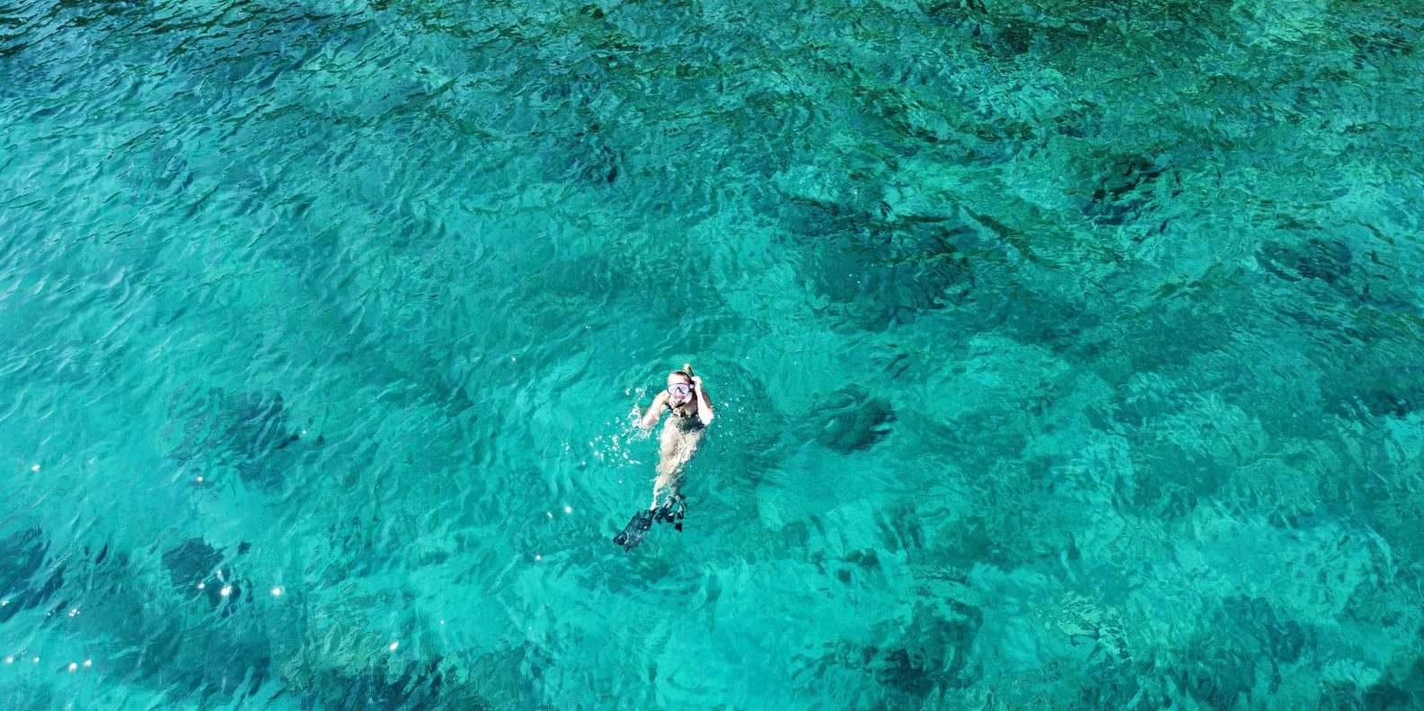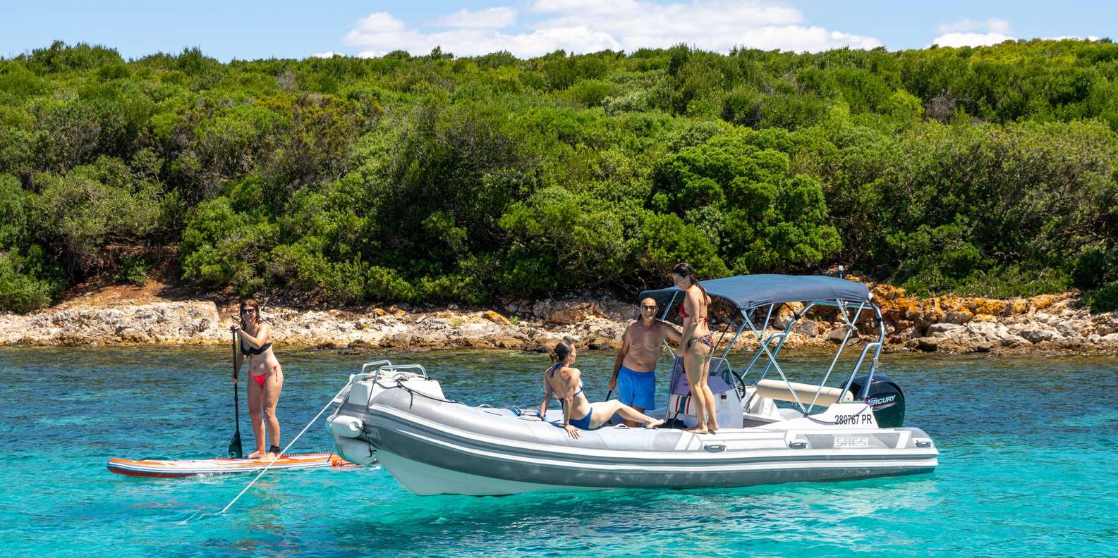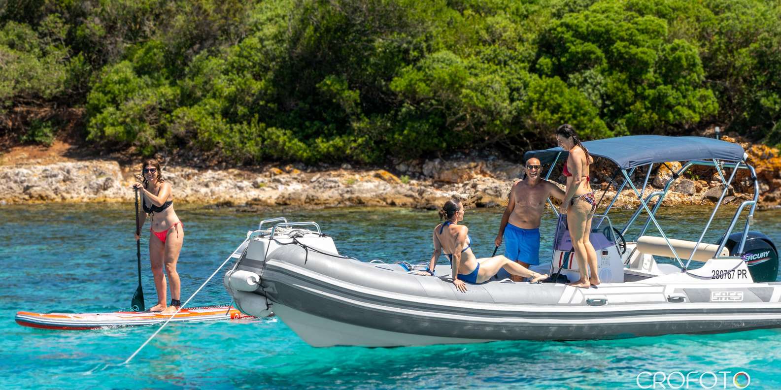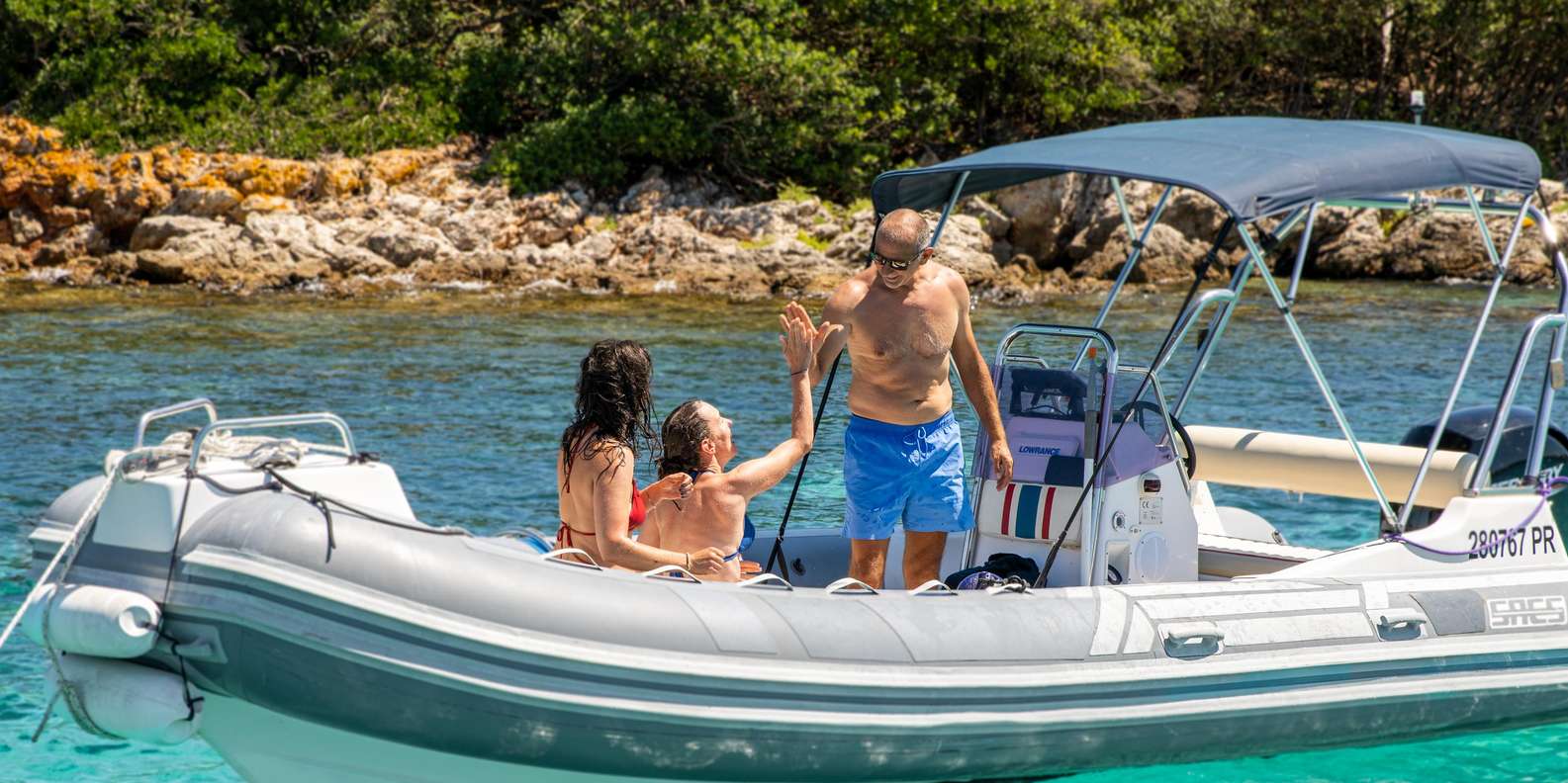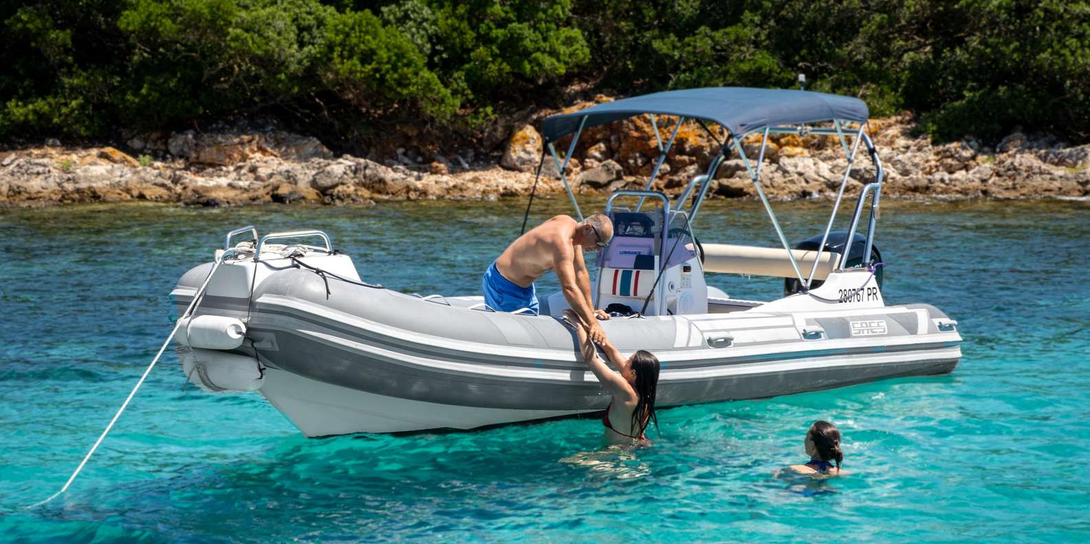 Führung mit erfahrenem Skipper Bequemes Schlauchboot mit Sonnenschutz, Liegefläche, Kühlschrank und Musikanlage Kalte Getränke an Bord Schnorchelausrüstung